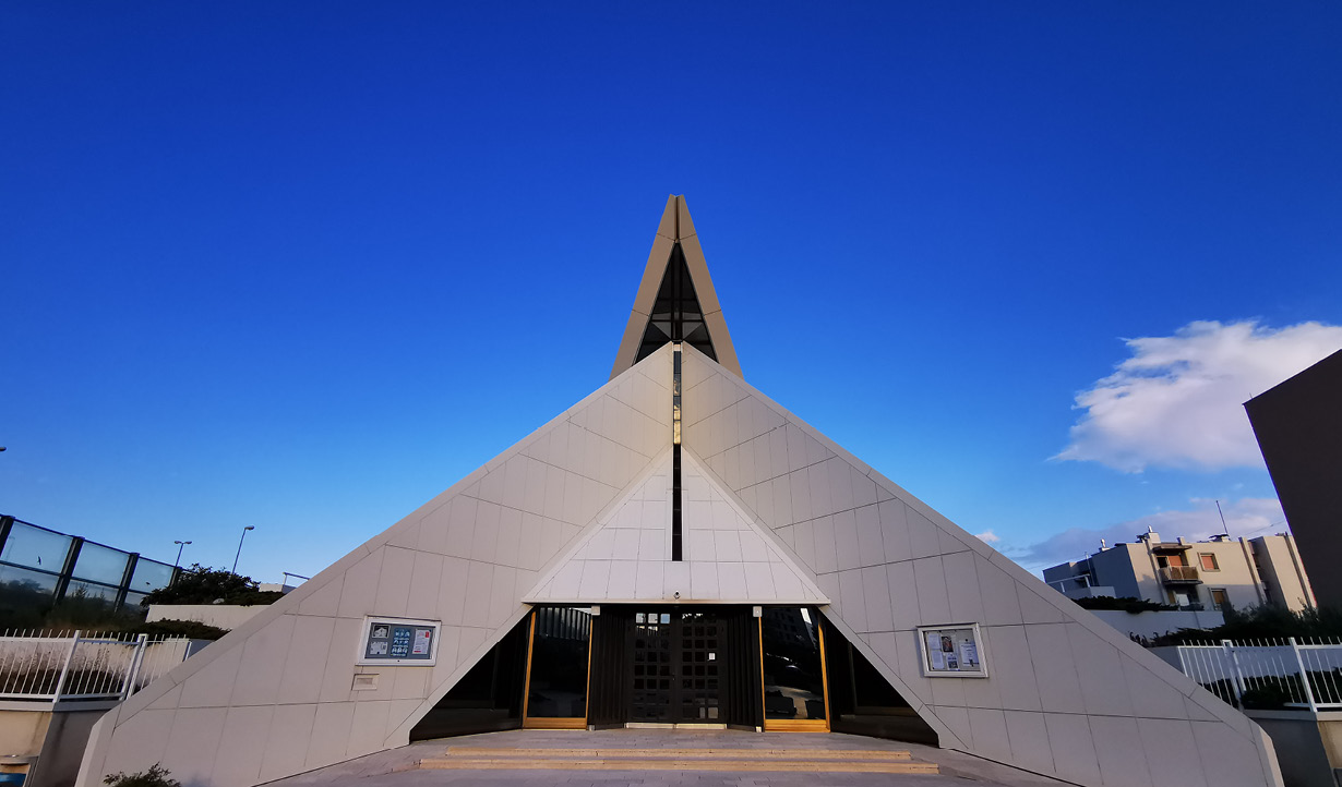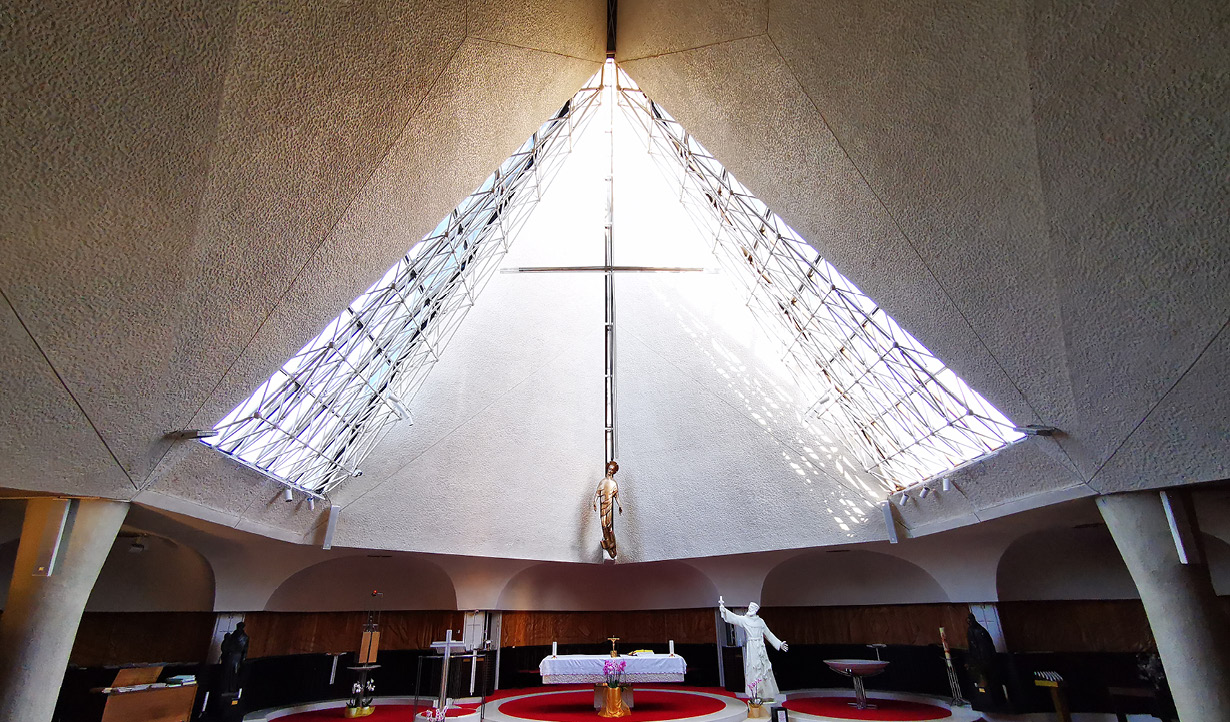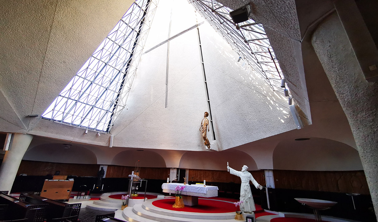 The church, built in 1988 and designed by architect Magaš, has an unusual "protruding" form that resembles a dove or ark. After many years, the existing audio system of the church was outdated and produced poor sound quality, facing acoustic challenges due to the large concrete interior surfaces and decorative woodcuts.