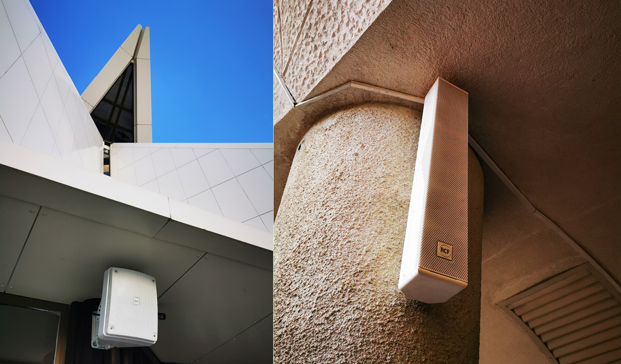 To improve sound coverage and speech intelligibility, LAV Project proposed installing new RCF speakers. Four RCF L 2406T W speakers were installed above the altar to cover the congregation area, four RCF DM 41 B speakers in the apses above the seats and choir, two RCF MQ 80P W outdoor speakers above the entrance doors and an RCF MR 40 W control speaker in the sacristy.