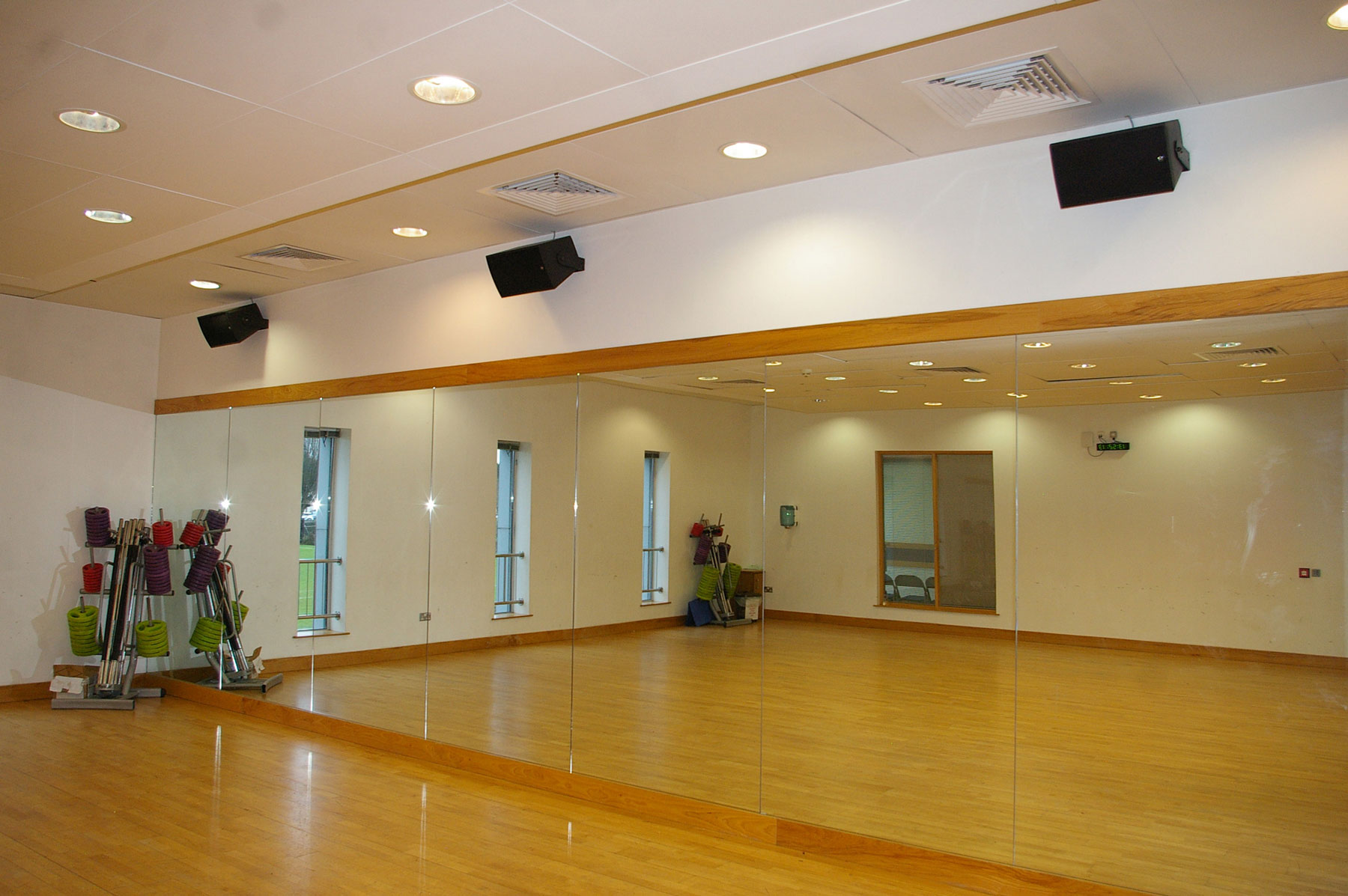 In the Tenpin Bowl there are eight Media Series M801 8” enclosures, and a further four of these speakers in the dance studios. Separate plug-in points are provided for local systems in the Dance Studio and Spinning Classes. RCF ceiling speakers, distributed through the complex on 100V line, comprise 146 x PL6X and 31 PL8X, with 23 compact DM41 surface-mount wall speakers feeding the corridors and peripheral areas.