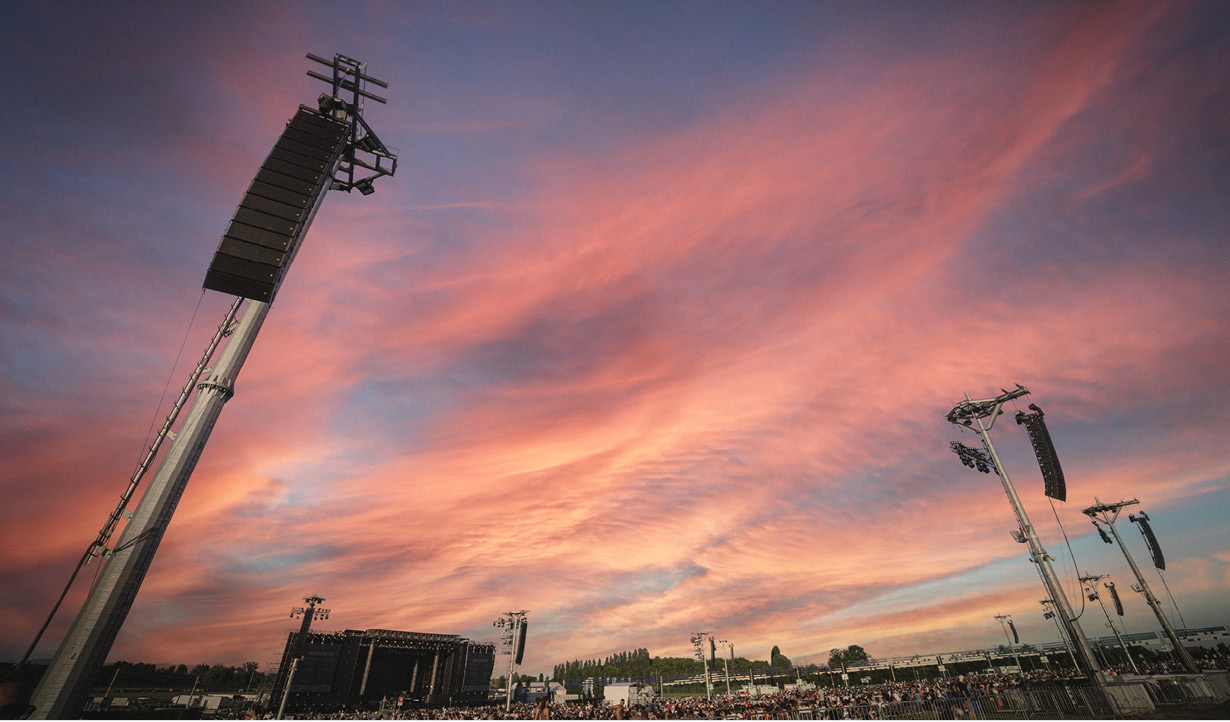 RCF provided 410 high-end loudspeaker modules from its premium brand TT+ Audio, featuring the new GTX line array and GTS double 19" subwoofers for approximately 2 MegaWatts of sound power. The sound system consists of a main system at the sides of the stage, with 4 line arrays covering the frontal area and an additional 10 systems distributed on permanent delay towers with coverage spanning the grassy, guitar-pick-shaped enclave of more than 85,000 square meters, where the slope descends toward the stage.
