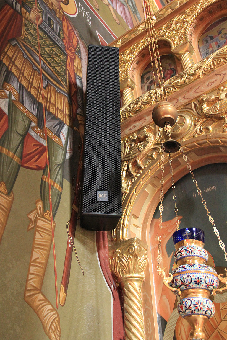 Since Orthodox churches reproduce only the spoken word and choral music, rather than recorded sounds or musical instruments Kariotis turned to high quality supercardioid mics for the cantors and highly sensitive mic caps for the priest — reinforced with high standards of power amplifiers, dynamic vocal processors, feedback eliminators, sound mixer and of course RCF L2406T columns for the main temple and RCF MQ 100L for the secondary room. A further point in favour of the RCF solution was that the priest was already familiar with the brand.