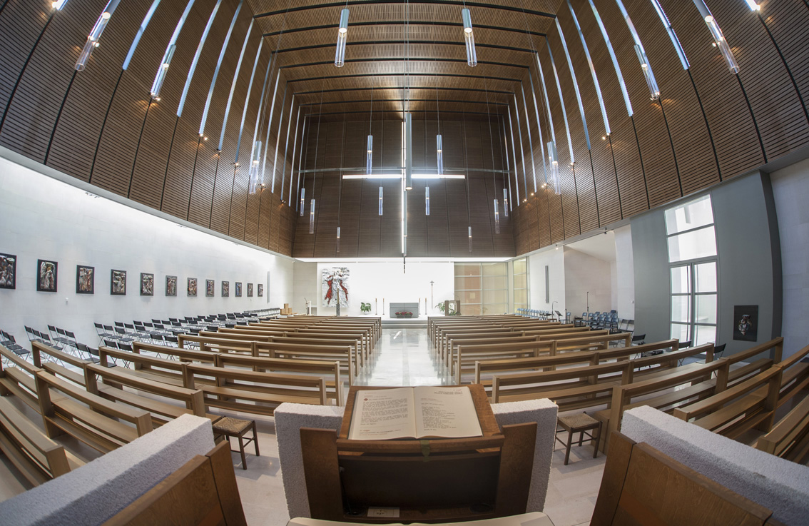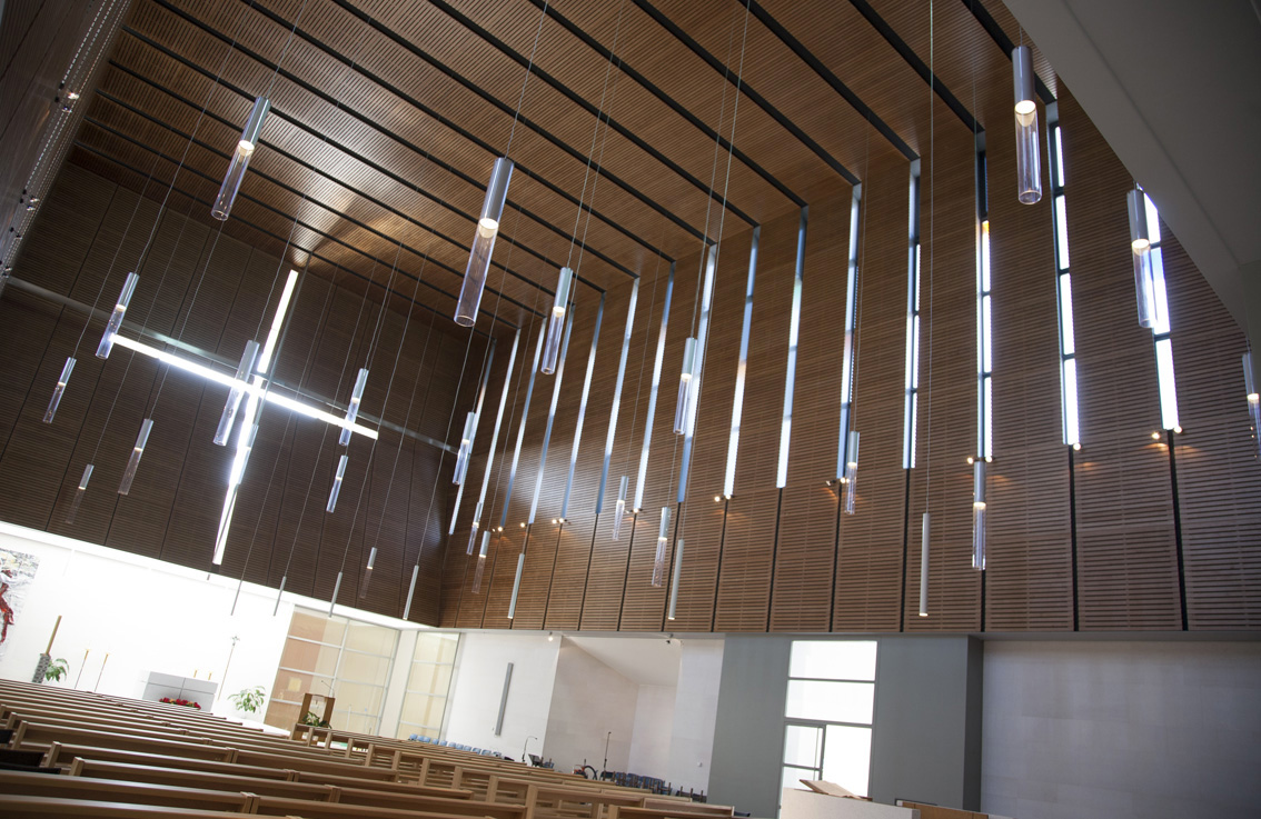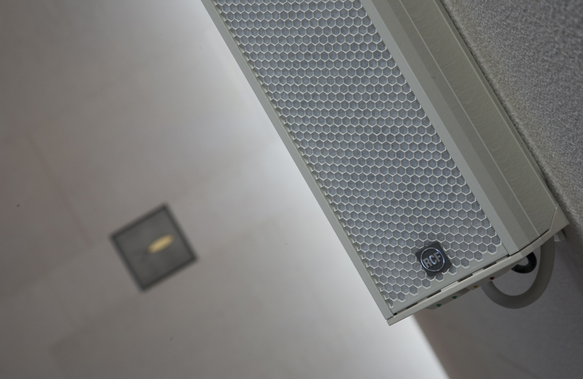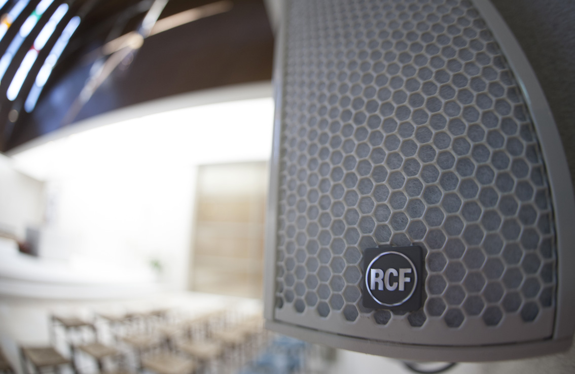 Il progetto dell’impianto di amplificazione è stato elaborato dall’ufficio di progettazione sistemi di RCF su richiesta e in collaborazione con l’Ing. Claudio Villa dello studio di progettazione ETA Studio, di Reggio Emilia. L’impianto è stato realizzato partendo quindi dai diffusori amplificati a colonna con controllo digitale VSA 2050, in quanto unici in grado di coprire l’intera aula liturgica partendo con due soli diffusori a fianco dell’altare (circa 24 metri). In questo modo è stato minimizzato l’impatto estetico sulle pareti, in particolare quella destra dove si trova la via crucis. Una seconda coppia di diffusori VSA 2050 si trova invece installata a fianco dell’ingresso e si occupa dell’amplificazione nel senso opposto. In pratica ci sono due impianti audio, ognuno in grado di coprire l’intera assemblea ma opposti tra loro. Infine, una centrale di gestione con matrice audio digitale stabilisce quali microfoni debbano essere indirizzati ai diffusori a fianco dell’altare e quindi amplificati dall’altare verso l’ingresso, e quali a lato ingresso e quindi amplificati da questo verso l’altare. Sono inoltre presenti, nascosti dalla veletta che crea la croce in controluce che sovrasta l’altare, i due diffusori a uso monitoraggio per il celebrante MQ80P di colore bianco.