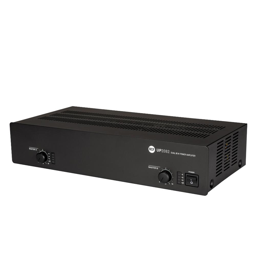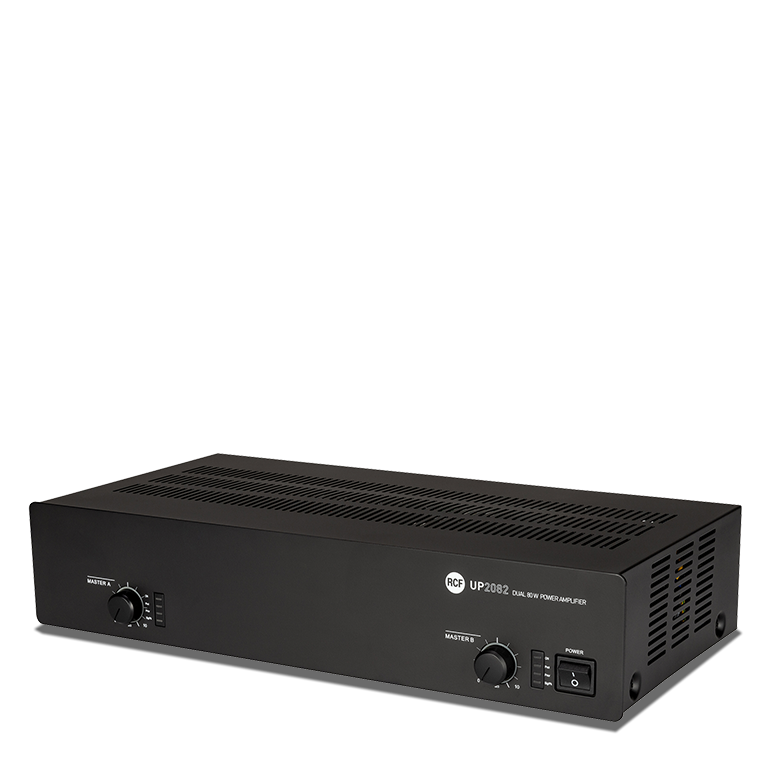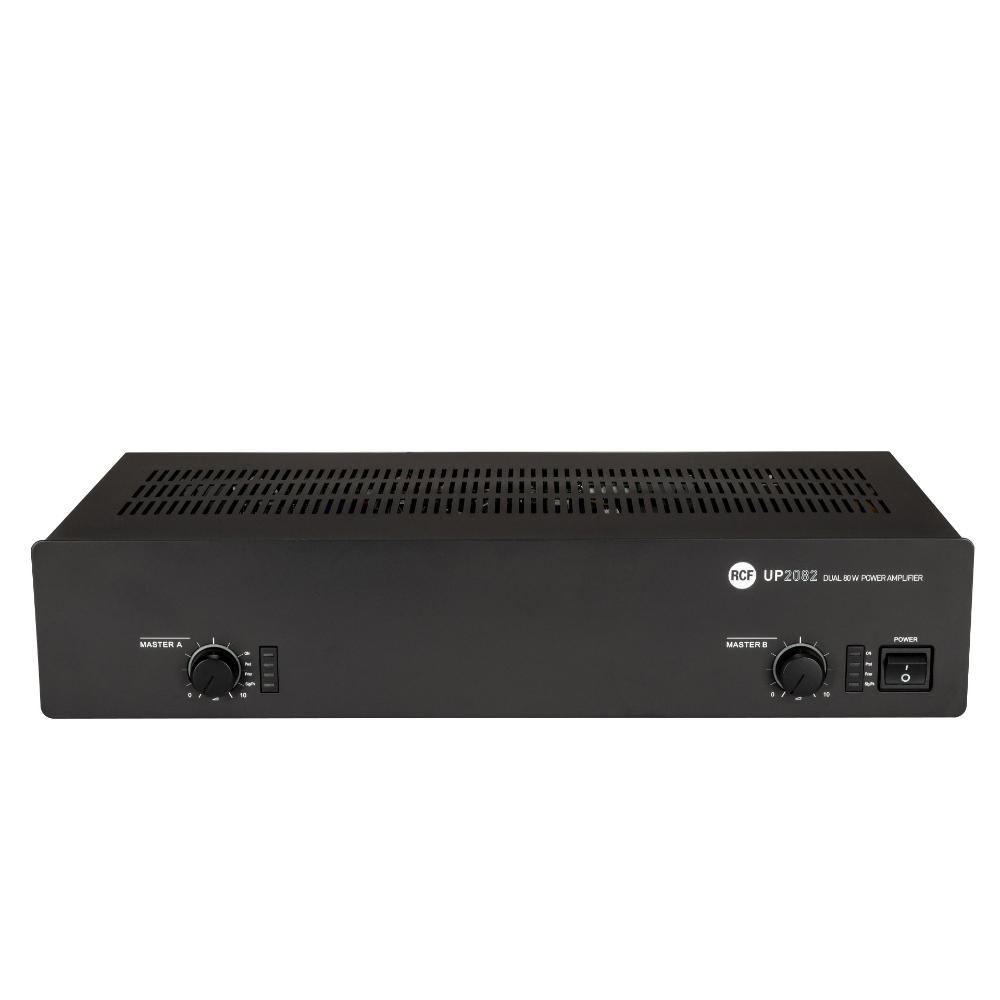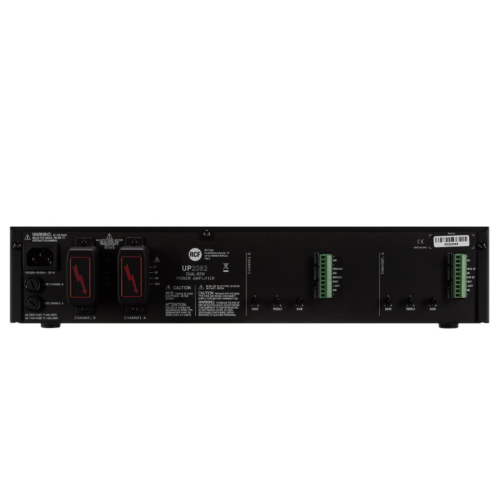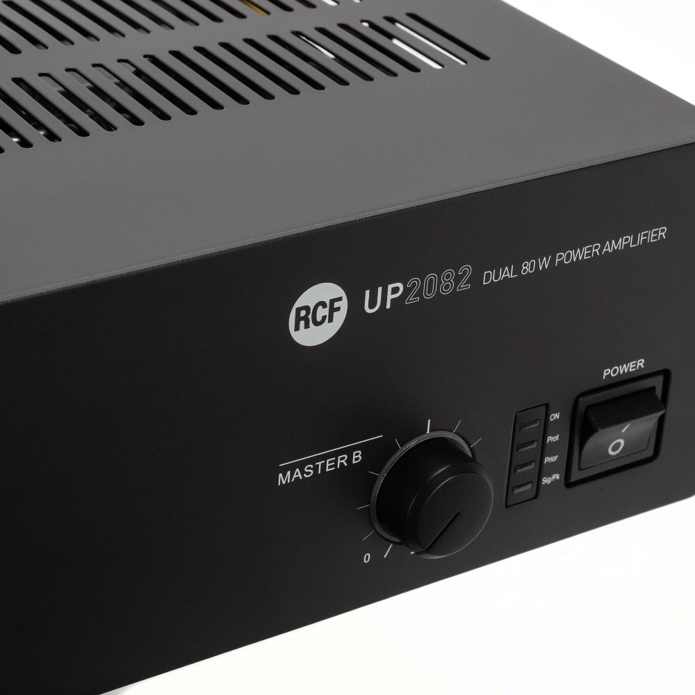 Die UP 2082 ELA Endstufe hat zwei Class-D Verstärkerkanäle, jeder Kanal hat zwei Line Eingänge und eine Leistung von 80 Watt an 4 Ohm bzw. 70/100V. Die Eingänge 1 haben Priorität (über Kontakt) gegenüber den Eingängen 2.