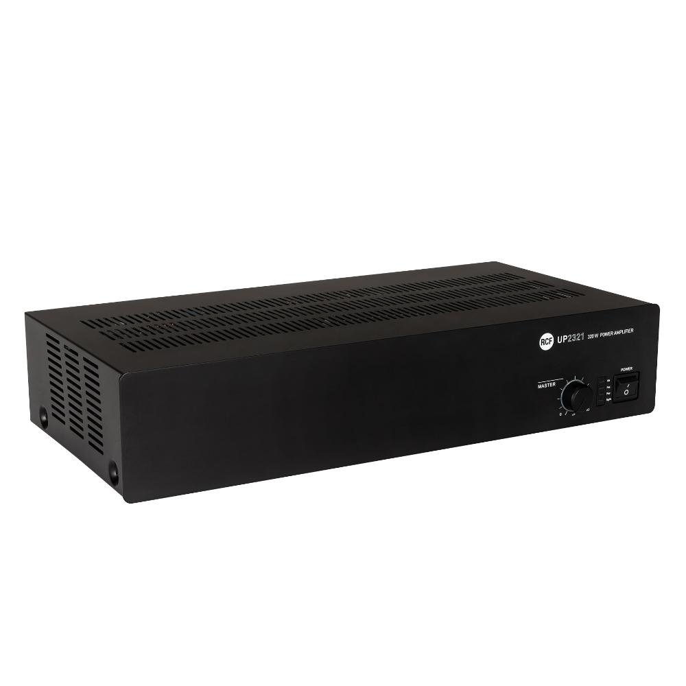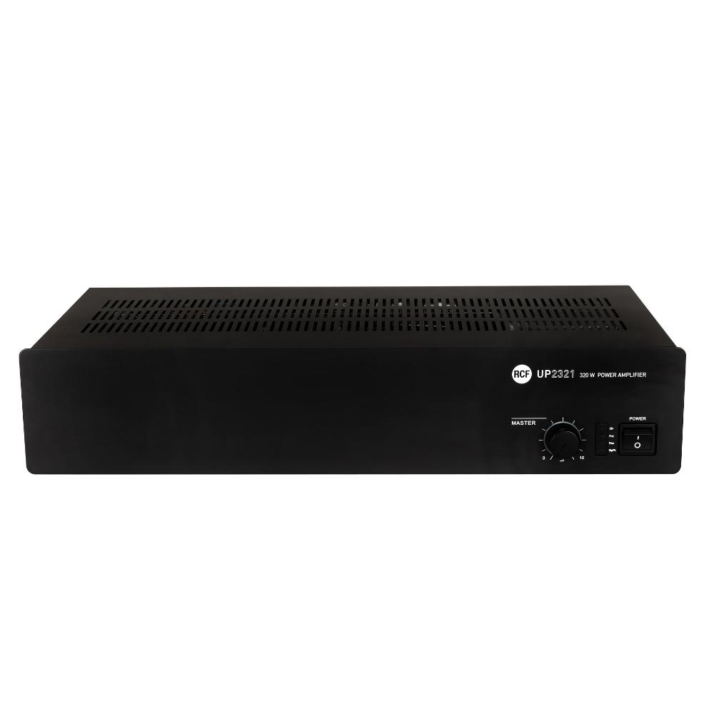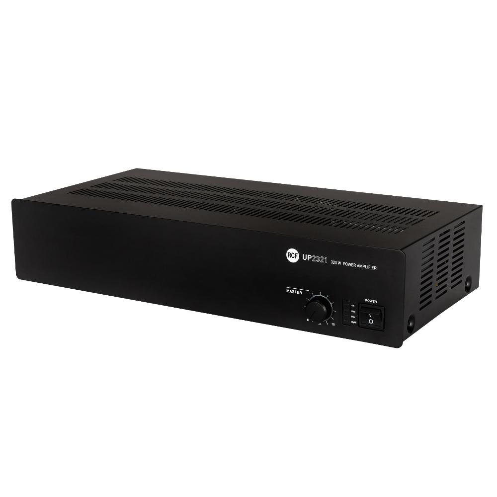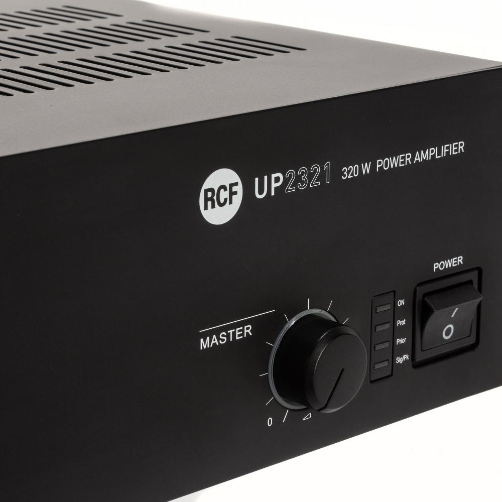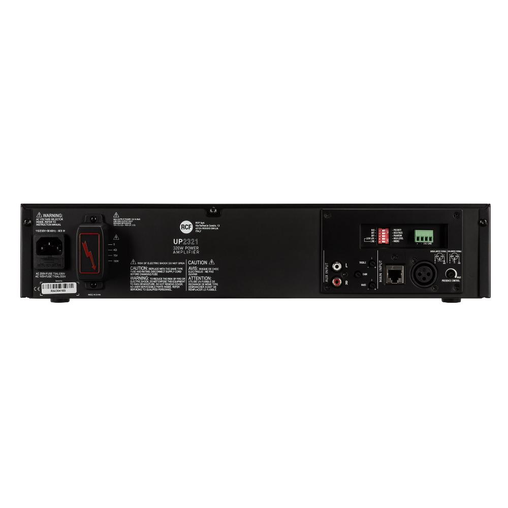 Die UP 2321 ELA Endstufe hat einen Class-D Verstärker, zwei Eingänge und eine Leistung von 320 Watt an 4 Ohm bzw. 70/100V. Der Eingang 1 hat eine RJ 45 Buchse für die BM 3001 Sprechstelle sowie XLR Buchse und Schraubklemmen und der AUX Eingang hat RCA Buchsen.