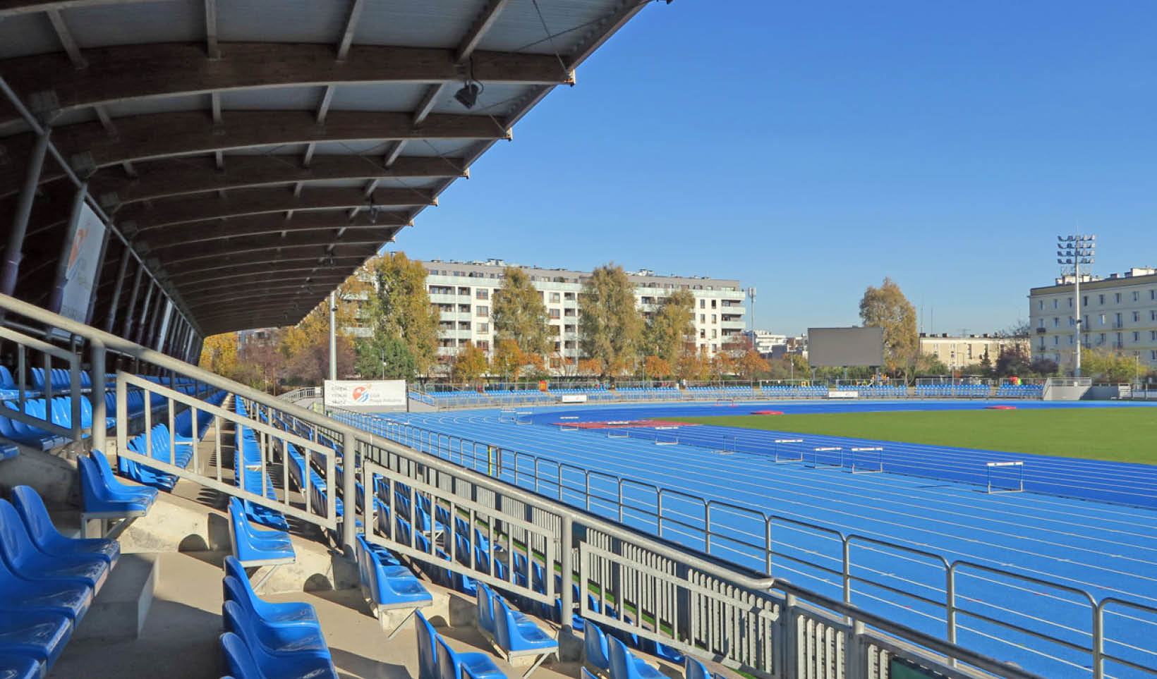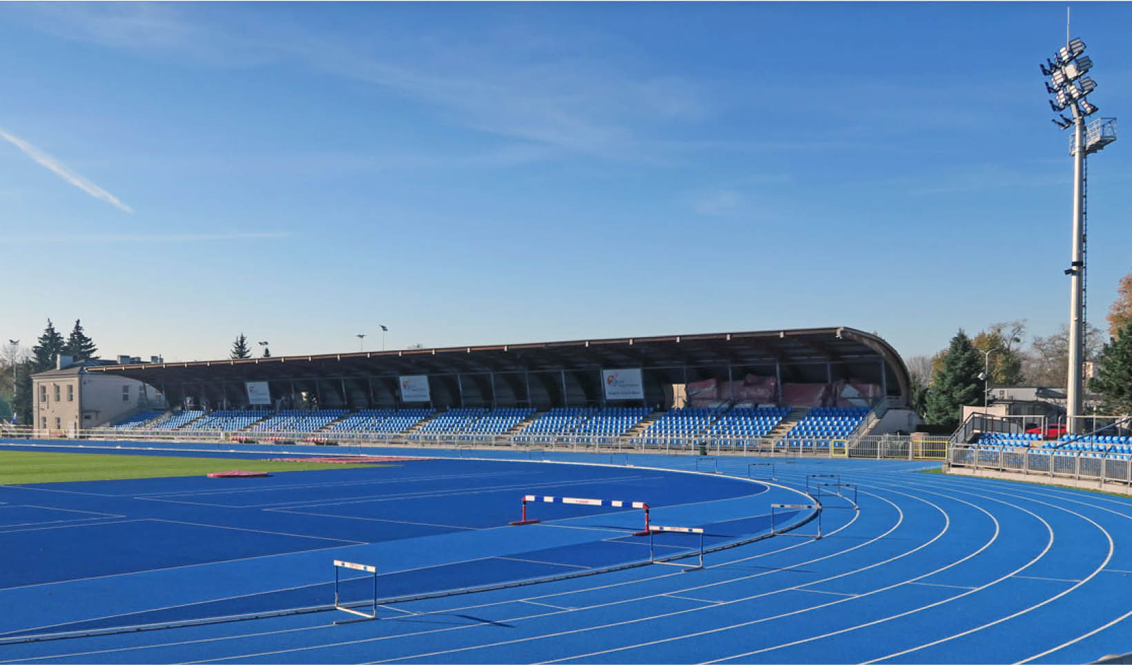 The stadium boasts state-of-the-art sports facilities, including a 400-meter track with 8 lanes, a unique 10-lane straight track, and full infrastructure for throwing and jumping competitions. Covered stands with a seating capacity for 3,000 spectators, modern changing rooms, an administration building, and energy-efficient LED lighting further enhance its appeal. The stadium is fully accessible to people with disabilities, reinforcing its role as a modern, inclusive sports and recreation center in Warsaw.