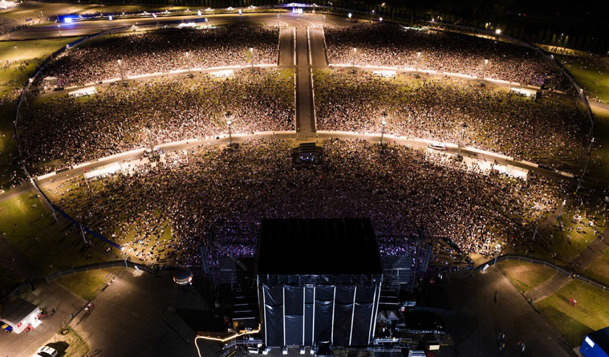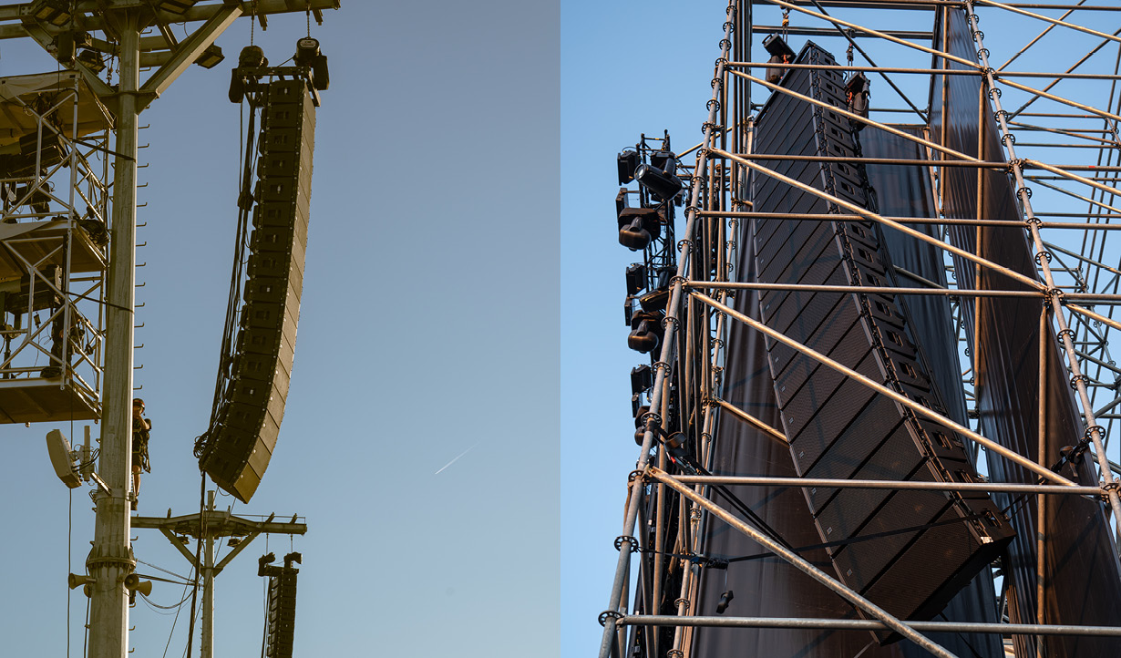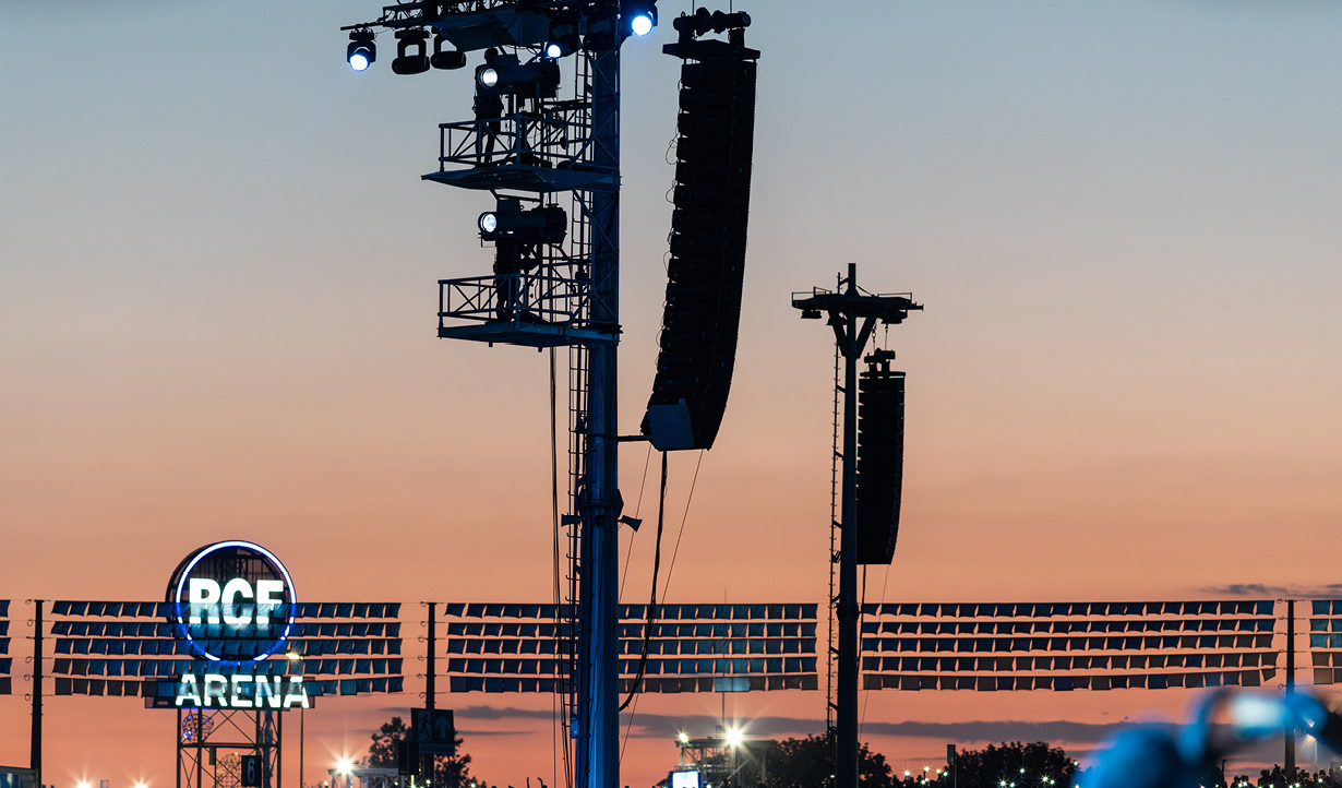 RCF provided 410 high-end loudspeaker modules from its premium brand TT+ Audio, featuring the new GTX line array and GTS double 19" subwoofers for approximately 2 MegaWatts of sound power. The sound system consists of a main system at the sides of the stage, with 4 line arrays covering the frontal area and an additional 10 systems distributed on permanent delay towers with coverage spanning the grassy, guitar-pick-shaped enclave of more than 85,000 square meters, where the slope descends toward the stage.