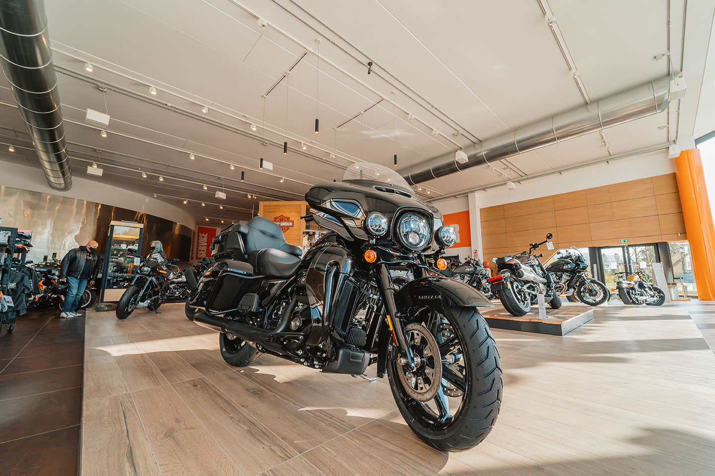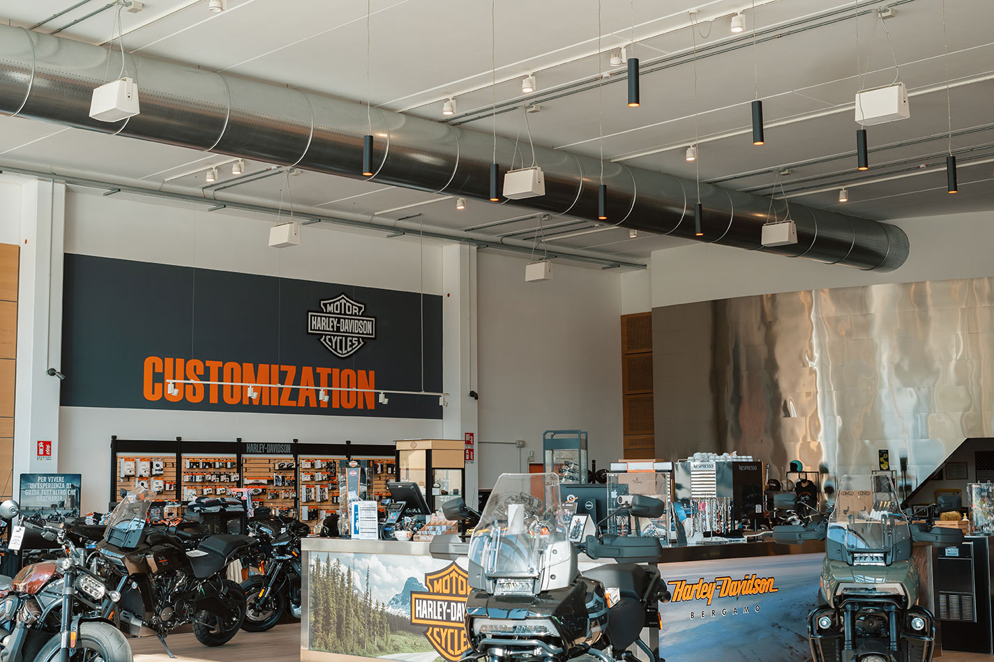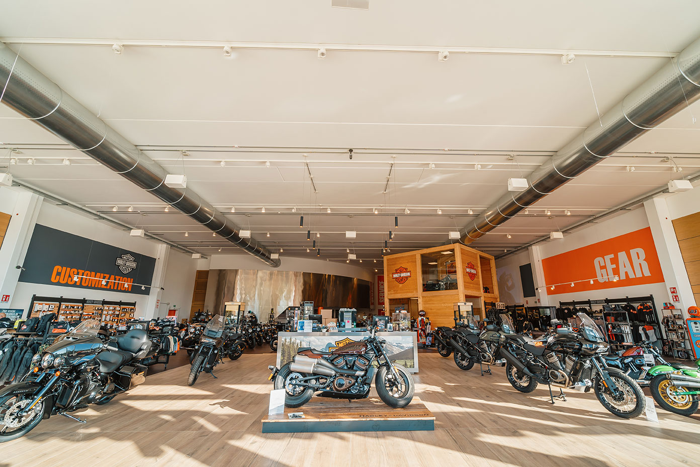 Bergamo, Italy - The new Harley Davidson Bergamo building extends 2,000 square meters, with showrooms, offices, rental spaces, and a customer service shop. The style of the new structure includes architectural elements that combine steel details with wooden elements, giving it an exceptionally bright atmosphere.