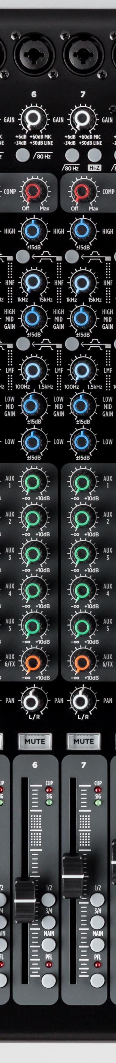 Purpose-designed high-grade preamplifiers, based on modern solutions and accurately selected components, offer high dynamics and exceptional sound clarity. Re-designed single-control dynamic compressors on mic input channels adjust the dynamic behavior of any instrument and voice. Two onboard Hi-Z inputs solve the need for the D.I. Boxes.