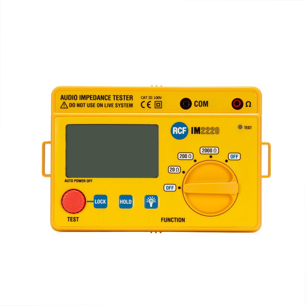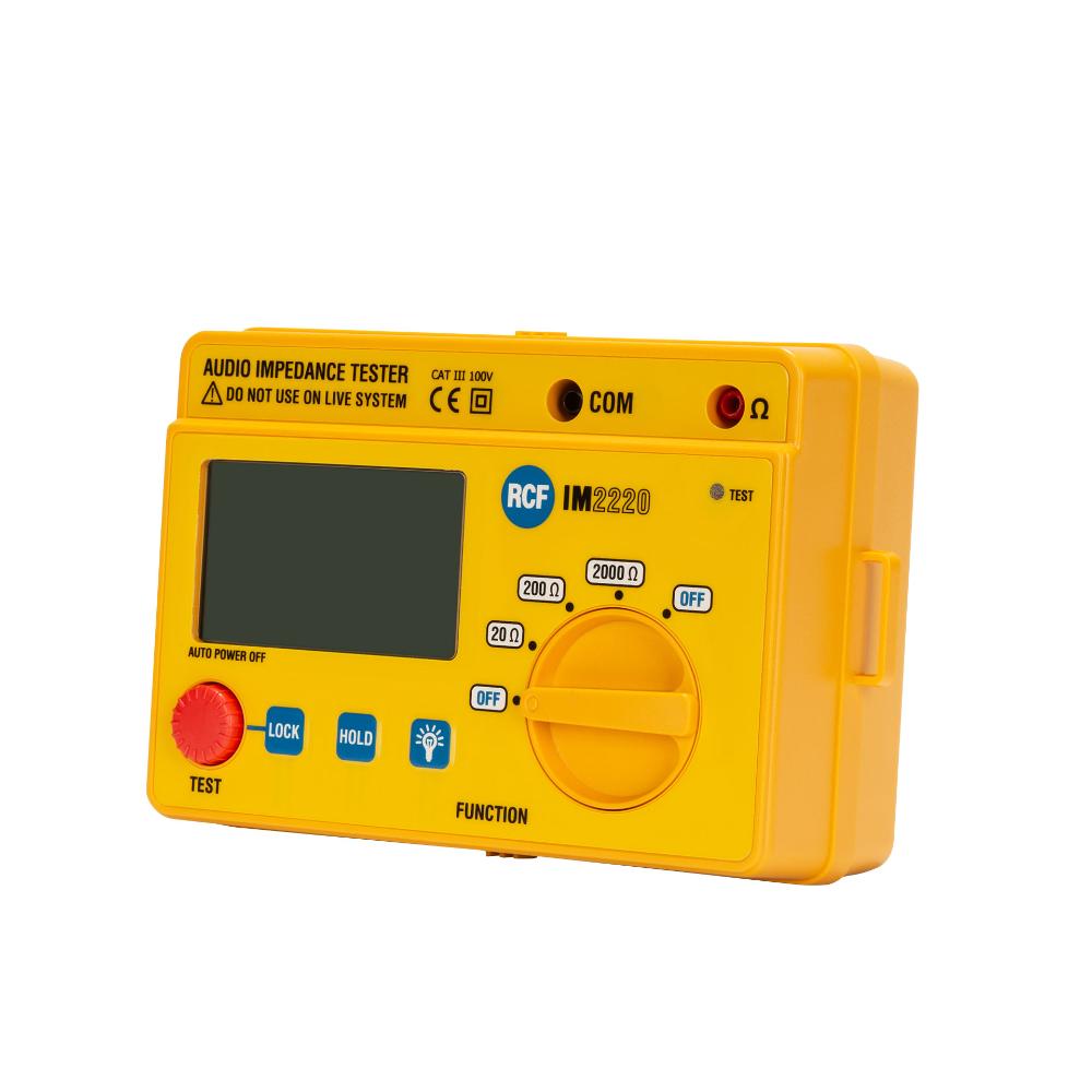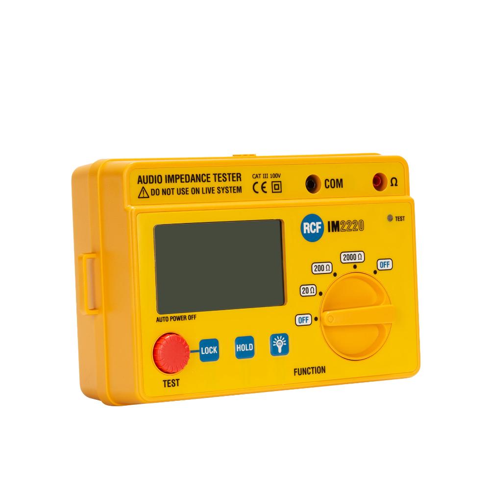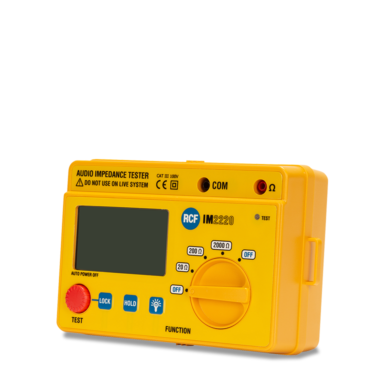 The IM 2220 is a portable instrument, easy to use for measuring the impedance of the constant voltage speaker lines or of a single loudspeaker. The test range is quite wide thanks to the three measure fields (20 Ohm, 200 Ohm, 2000 Ohm). It is suitable for both commercial audio and domestic use. The IM 2220 is easy to use, comfortable and safe, thanks to the large control knob, to the large display and the high insulation