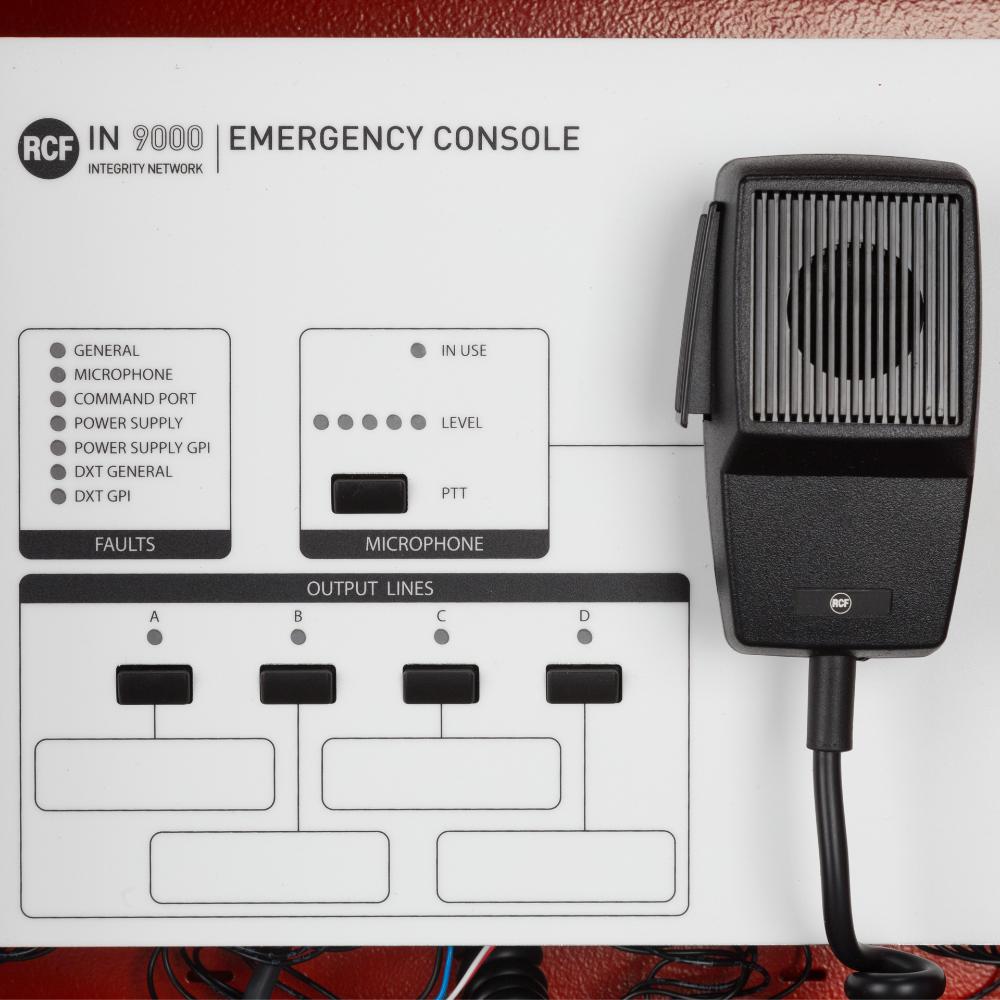 IN 9000 is a firemen, wall-mount emergency microphone console exclusively dedicated to DXT 9000 Voice Alarm system, conceived to provide an analog backup solution for emergency communications in case of interruption of the main communication bus among system’s units. It features complete self-diagnostic functionalities and system status reporting in compliance with EN 54-16:2008 standard. It shall be powered by an external power supply certified EN54-4 providing at least 20 W output power. The audio output can be distributed up to 64 DXT 9000 units, and routed on 4 independent lines, selectable on console front panel.