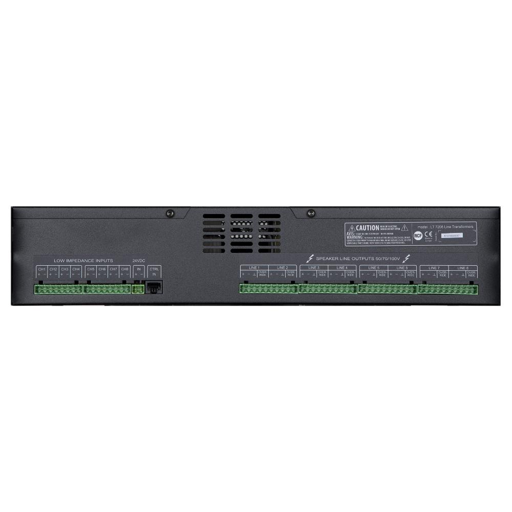The LT 7208EN unit has 8 internal transformers (80 W / each) to convert the 8 Ohm loudspeakers outputs of MU 7100EN master unit into constant voltage lines (100 - 70 - 50 V) for loudspeakers equipped with line transformers. It allows to implement several power configurations, such as 8 x 80 W, 4 x 160 W and 2 x 320 W.