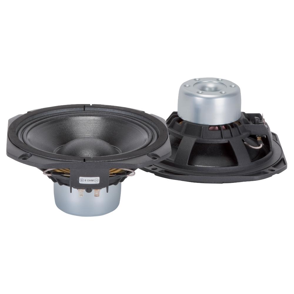 The MB8N251 is a 8” neodymium mid-bass driver with an excellent linearity, good efficiency and high power handling capabilities. The 2,5” aluminium voice coil combined with a high strength fibreglass former allows high efficiency and good frequency response extension. Aluminium basket and magnetic assembly design provide an excellent heat dissipation and very low power compression. The M-roll surround shape combined to spider design offer good linear displacement and precise low frequency reproduction.