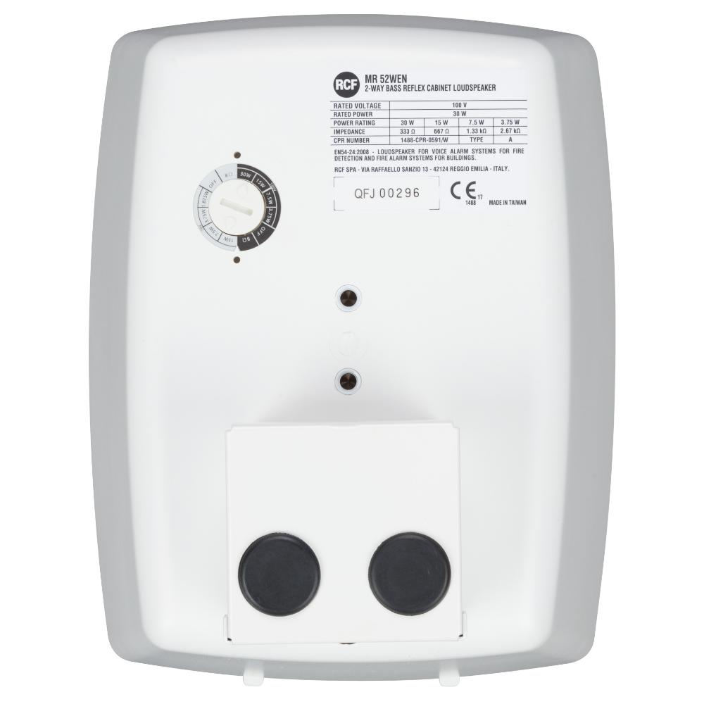 MR 52EN is a compact two-way speaker ideal for both alarm messages broadcasting and business music systems. The installation is fast and efficient using the adjustable mounting bracket (included). The enclosure is made of high-density ABS and includes a protective steel grille and connection cover. The terminal connection blocks, for input and output flameproof cables, are made of ceramic material. A thermal fuse protects the integrity of the line in case of heat affecting the speaker. Power selectable with dedicated switch.