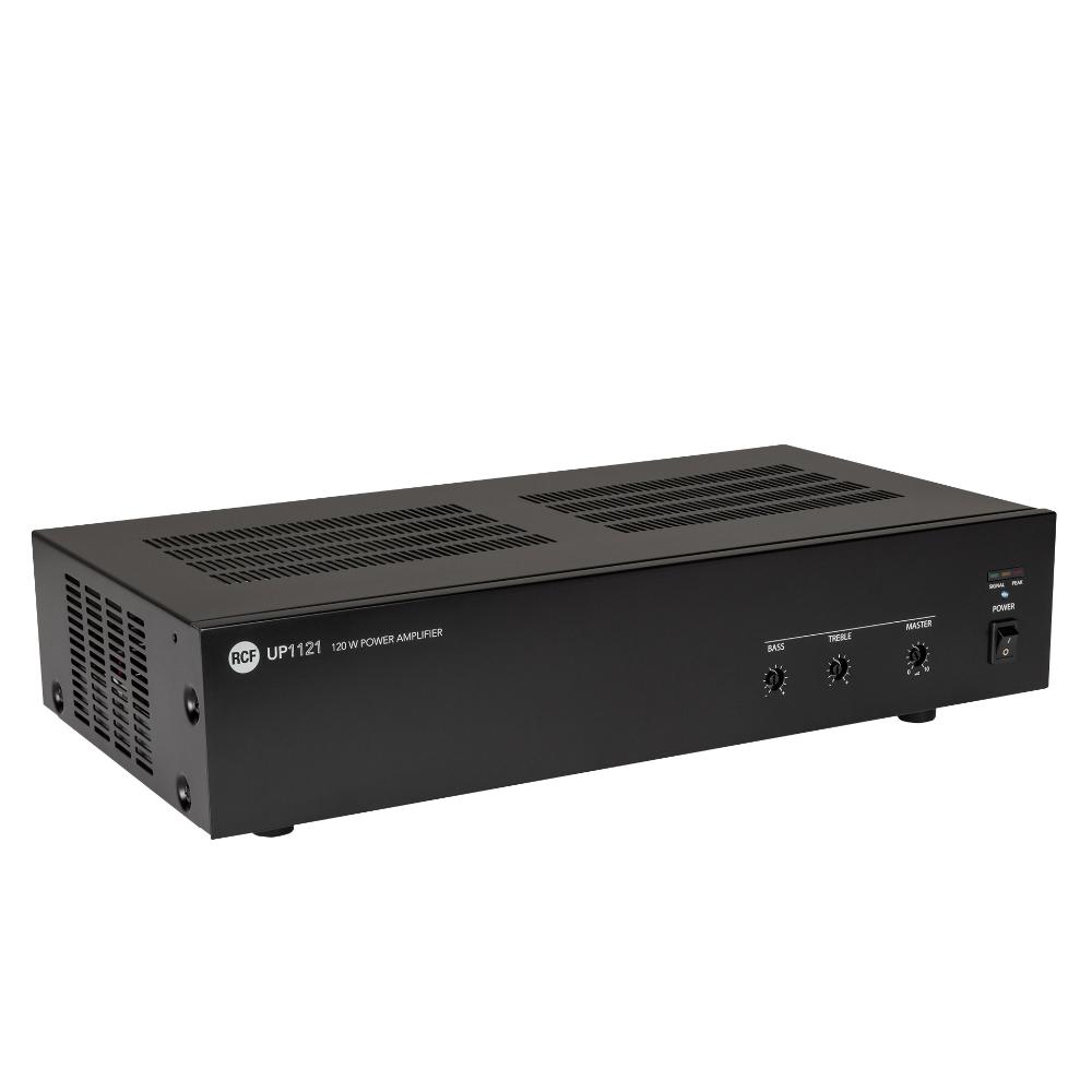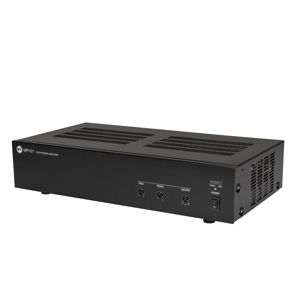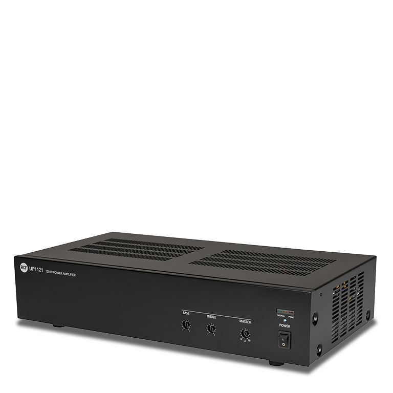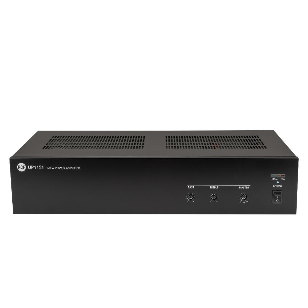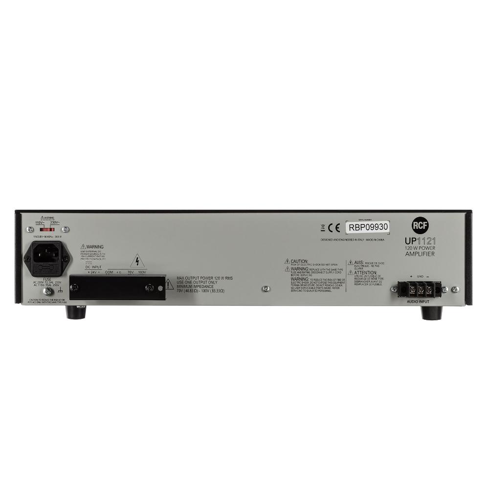 UP 1121 is a 120 W power amplifier having a single balanced ‘line’ level audio input. The amplifier output is available either for low impedance loudspeakers (min. 4 O) or 100 – 70 V constant voltage line (for loudspeakers having 100 – 70 V transformers). In addition to the connection to the mains, it can also be powered by batteries (voltage: 24 V dc), in order to ensure its proper operation even when the mains supply is unavailable.