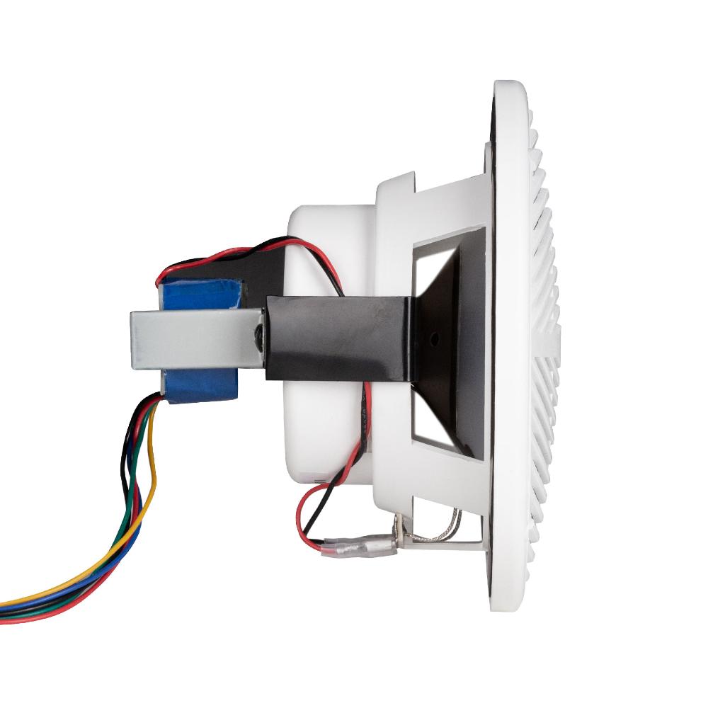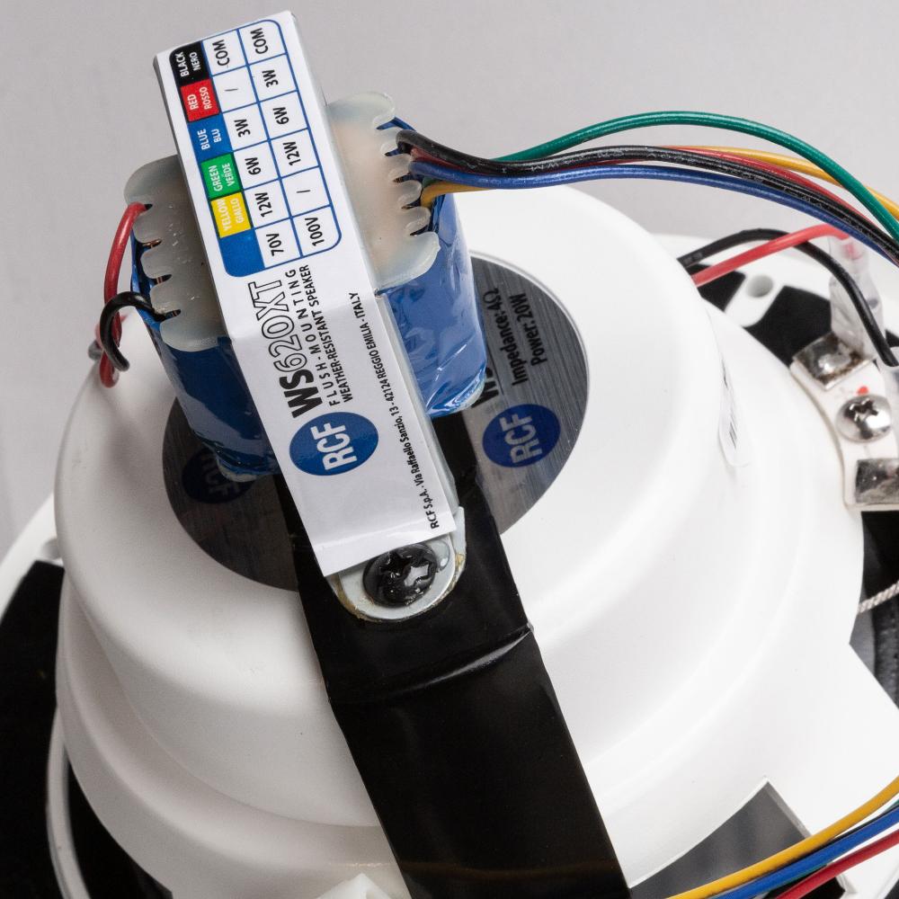 WS620XT is a ceiling speaker that can be flush-mounted in false ceiling or panels. It has been designed for external use, even on boats. WS620XT incorporates a 160 mm (6”) loudspeaker, with a 25 mm (1”) coaxial tweeter. The speaker is equipped with a line transformer that enables direct connection to constant voltage systems at 70 V or 100 V. It is possible to use the low impedance taps (4 ohm) removing the transformer. In this case the installation can be done even with reduced depth.