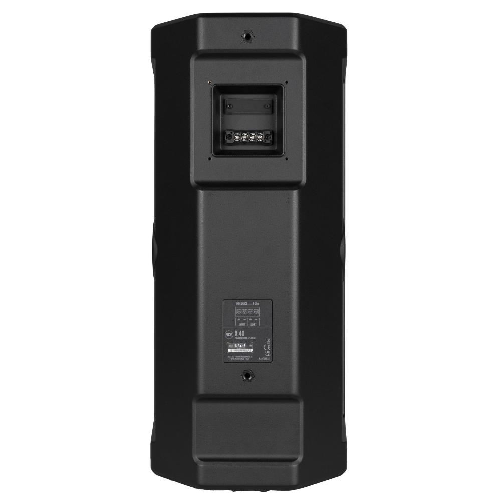 X 40 is a two-way professional speaker designed for a wide range of fixed indoor and outdoor installations requiring high audio quality and extreme durability. Thanks to the state of the art RCF transducers, two 10’’ high power woofers with 3.0’’ voice coils and one 1.4’’, titanium dome, compression driver with 4.0’’ voice coil, it offers exceptional max SPL level with a balanced and clear sound. The asymmetrical horn with 110° by 60° directivity allows an efficient coverage at different distances, as for example in the case of a racing circuit grandstand. The cabinet is made of high-density polyurethane, while the aluminum grille guarantees protection from dust and rain, thanks to a waterproof fabric layer. A bracket for wall mount vertical installation is included.