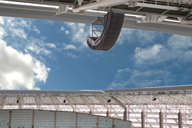 The use of standard fly-bars was excluded from the beginning and a special frame was fabricated instead. The aim was to create line arrays flown parallel to the ground, ensuring perfect sound coverage to the whole audience when the cabinets are placed above the tribune.