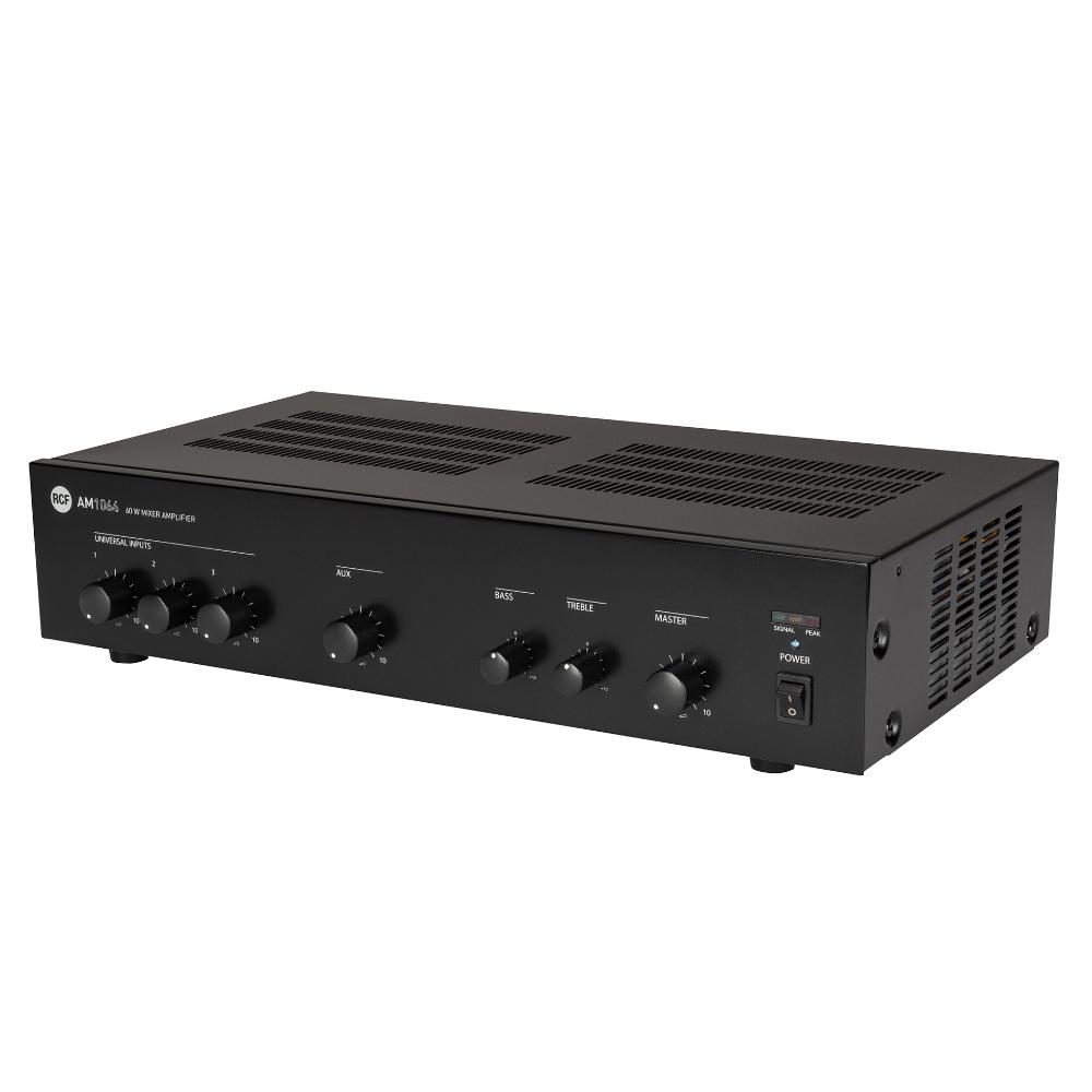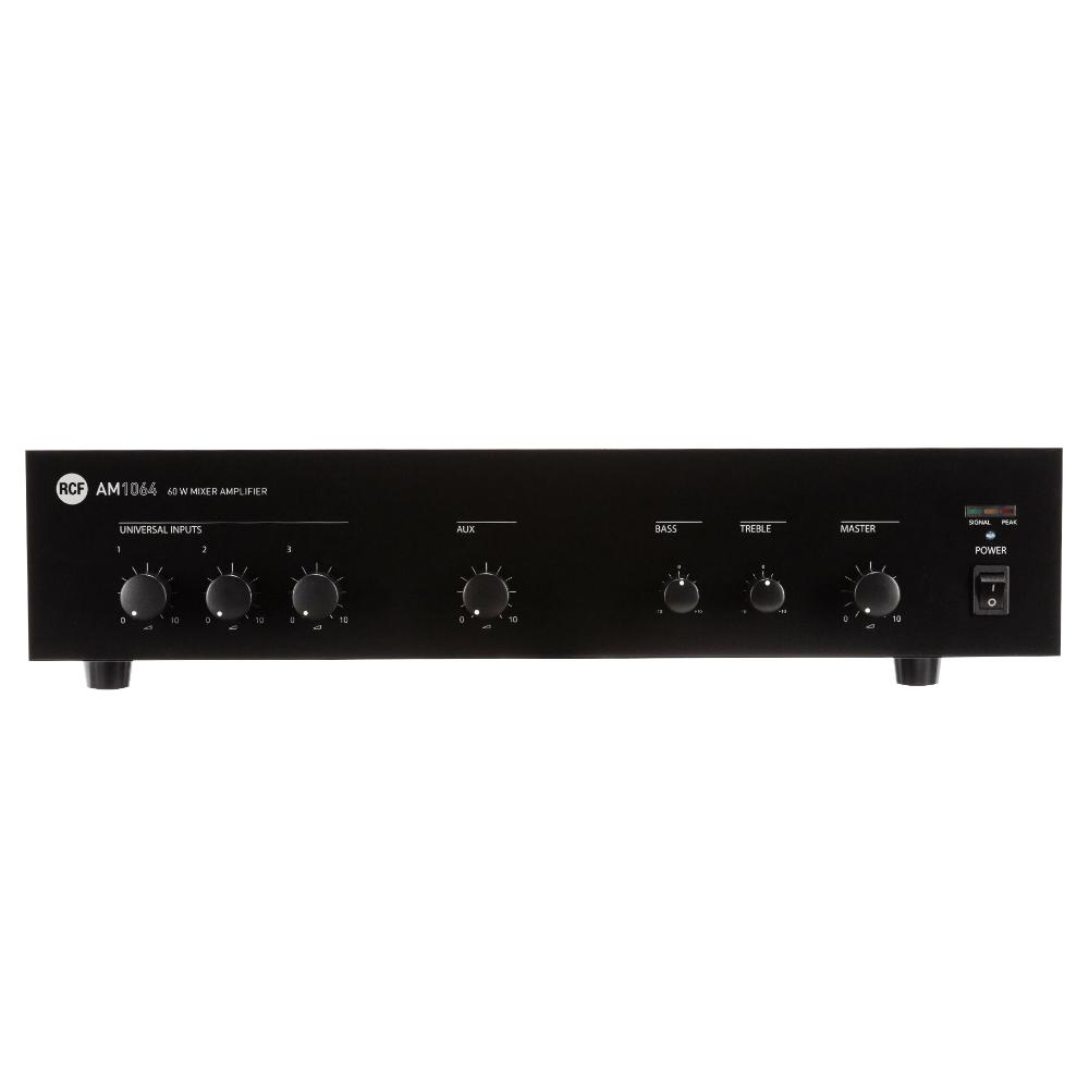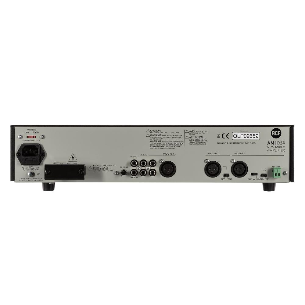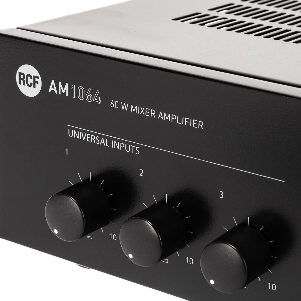 AM 1064 is a 60W mixer-amplifier having 3 audio inputs. Audio input 1 has Phantom power supply and get the priority over the other audio inputs through an external command or automatically thanks to the ‘VOX’ circuit. Dual RCA connectors can be used to link stereo (unbalanced) sound sources (e.g. CD – MP3 players, tuners, etc.). The amplifier output is available either for low impedance loudspeakers (min. 4 Ohm) or 100 – 70 V constant voltage line (for loudspeakers having 100 – 70 V transformers).