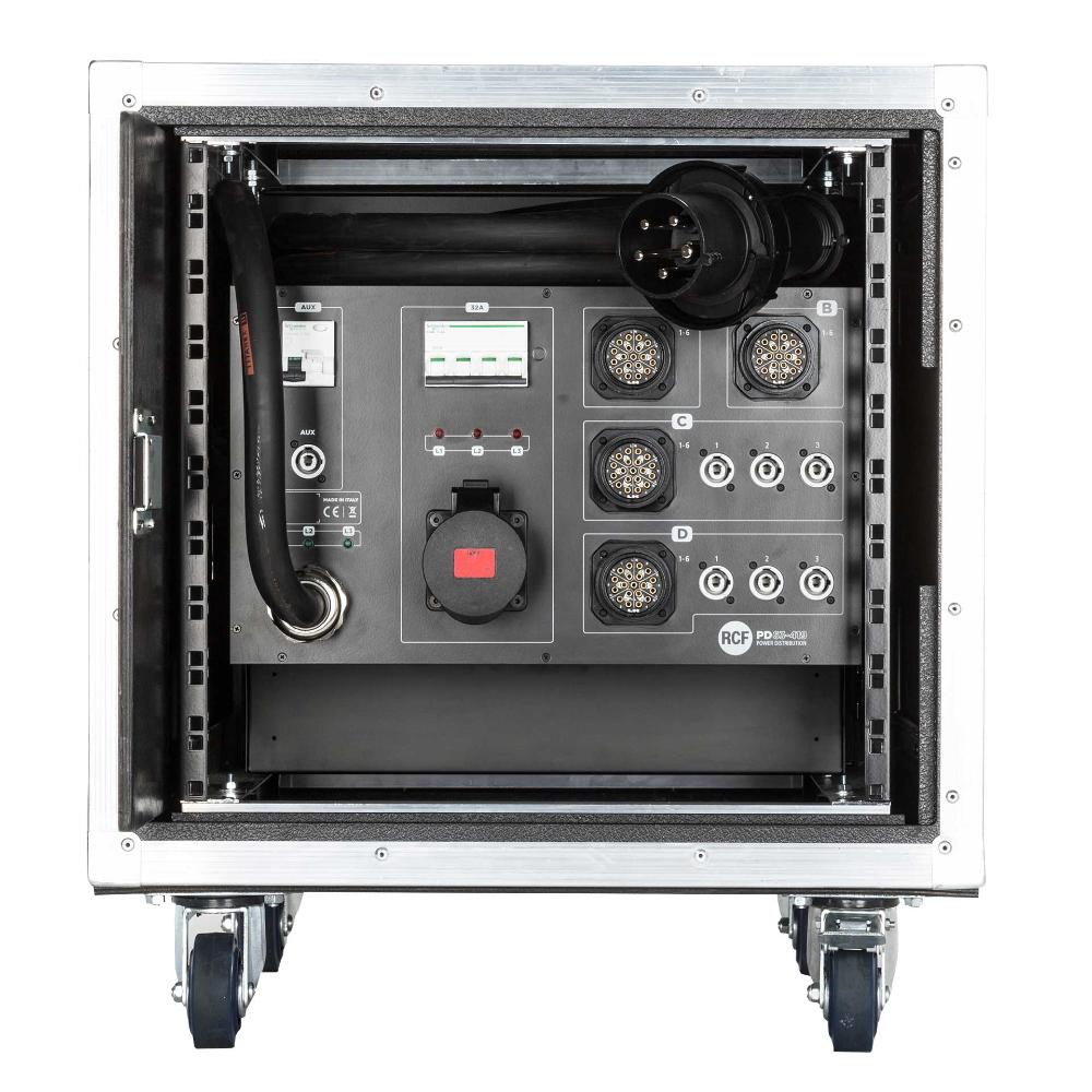 El rack de alimentación PR-63 dispone de la unidad de alimentación PD 63 A-419 que incorpora una entrada de alimentación Cekon de 63 A con cable fijo de 5 m. La alimentación trifásica se distribuye entre una salida Cekon de 32 A, 4 salidas LKS19, 6 salidas Powercon y 1 salida auxiliar Powercon que garantizan el funcionamiento del rack de control CR 16-ND. Todas las salidas disponen de RCBO (interruptor diferencial residual con protección contra sobreintensidades) para garantizar una fiabilidad máxima. En caso de daños solo se evita la salida defectuosa, mientras que el resto del sistema sigue funcionando.
