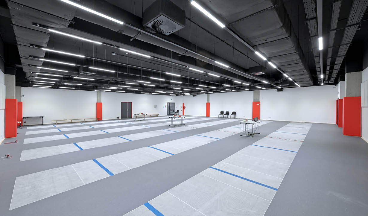 Inside, specially designed areas are available for martial arts such as judo, wrestling, karate, and fencing, as well as a circular athletics track measuring 200 meters in length and a 60-meter sprint track. Covering a built area of 4,861 m², COS also provides access to a modern gym, changing rooms, wellness and recovery areas, and storage and technical spaces.