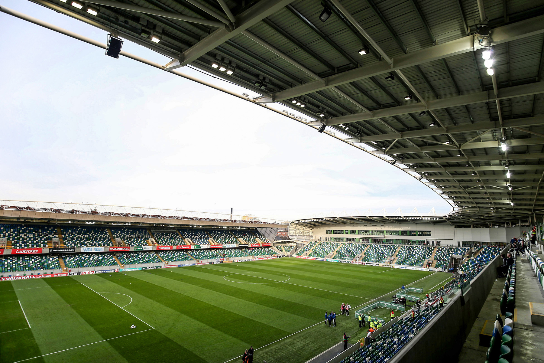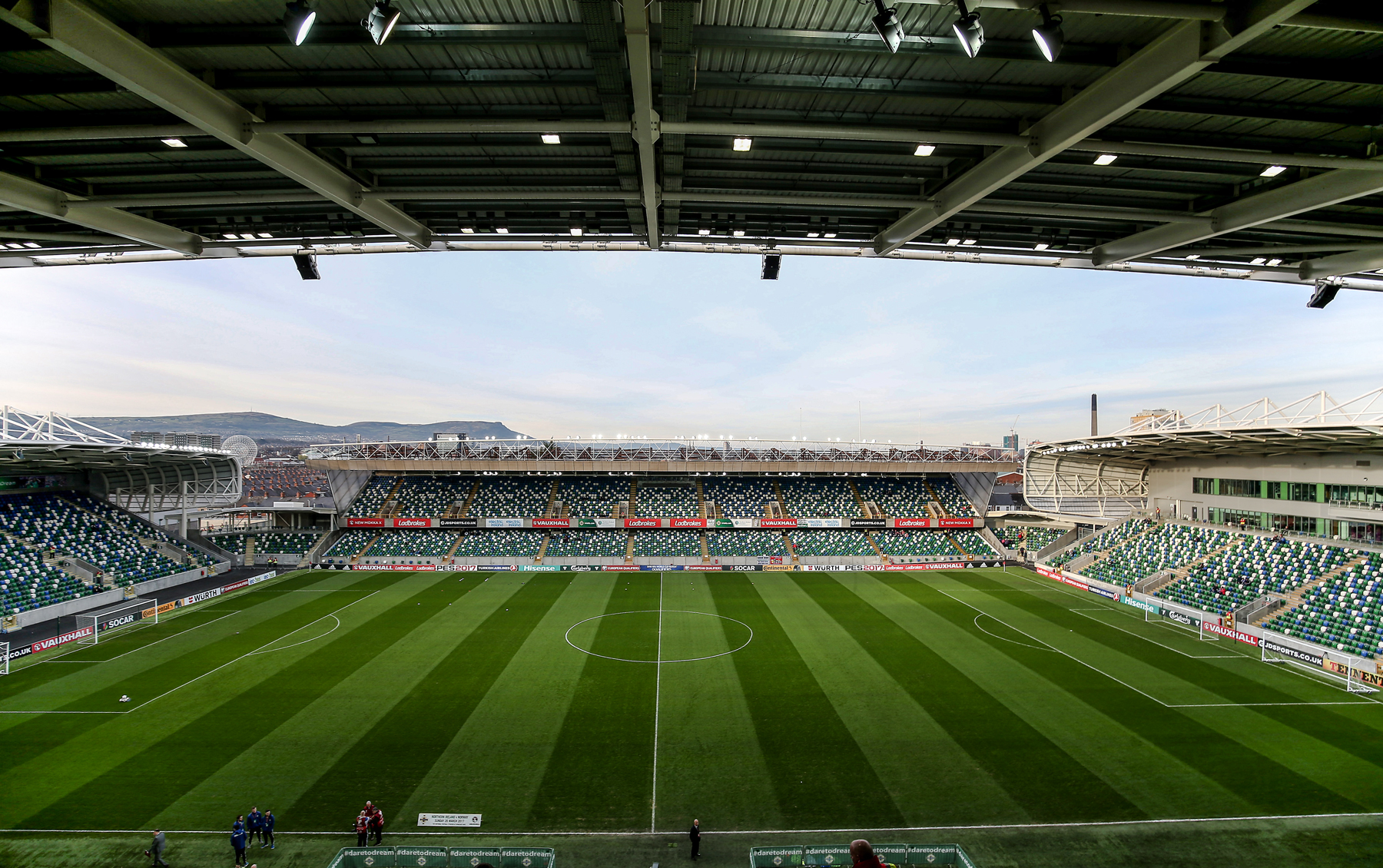 The National Football Stadium at Windsor Park, Belfast, has been completely redeveloped, following £31m of funding from the Northern Ireland Executive. This included demolition and rebuild of the South and Railway (East) stands, and the subsequent demolition of the West stand, and complete renovation of the North stands by building contractors, O’Hare & McGovern.