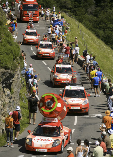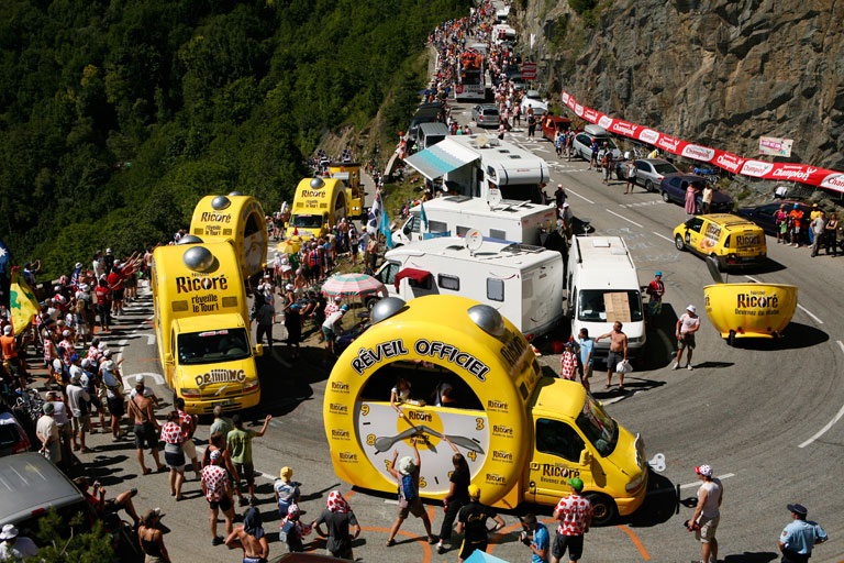 Le Tour de France est accompagné par la caravane publicitaire qui démarre deux heures avant le début de chaque étape dont elle emprunte tout l'itinéraire. Au fil des années, la caravane publicitaire est devenue célèbre et fait maintenant partie intégrante du spectacle offert par le Tour de France. Les sponsors de l'épreuve redoublent d'imagination pour décorer les véhicules de la caravane de façon toujours plus attrayante. Sur les routes, ils offrent aux spectateurs des cadeaux, des casquettes et des gadgets tels que la célèbre main verte du PMU.