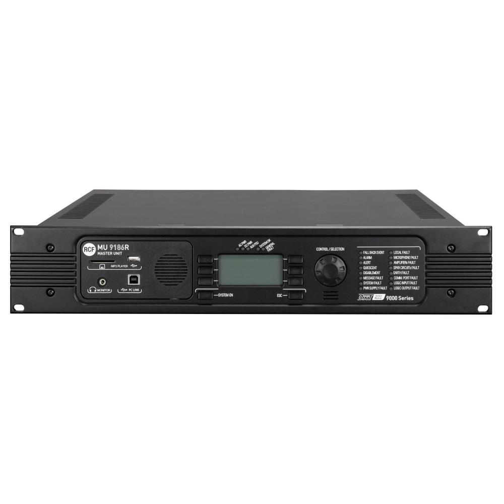 MU 9186R is the DXT 9000 system master unit without on-board power amplifier, equipped with DANTE module: it shall be used for large applications requiring to connect several distributed sub-systems. This can be achieved connecting up to 8 master units on a dedicated network and distributing two audio channels among all units. The system can be completed with several models of emergency microphone consoles, EN 54-4 power supplies, accessories and management/monitoring software.
