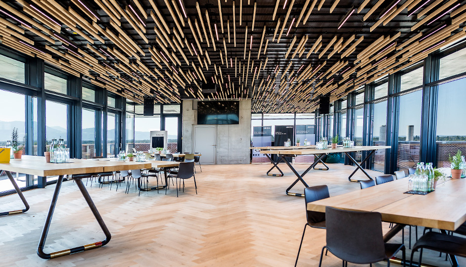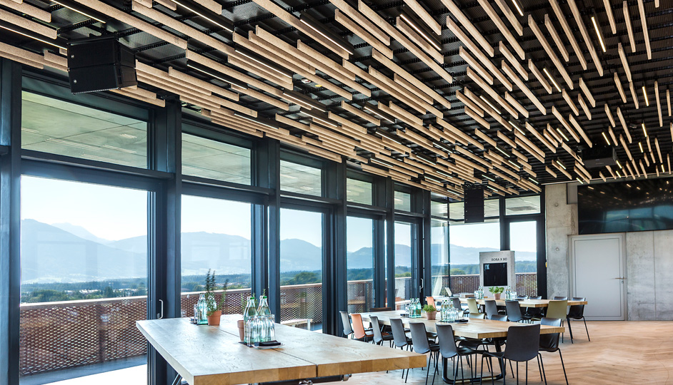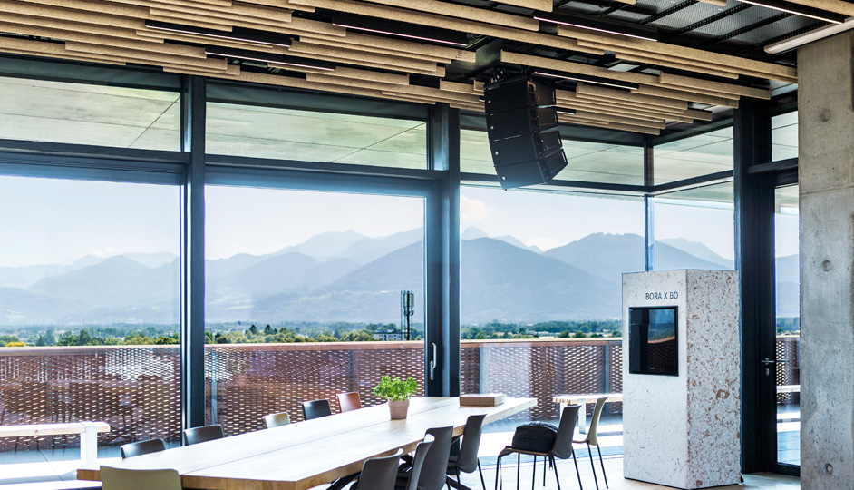 Raubling, Germany - BORA, the company that invented the cooktop extractor systems for kitchens in private homes and restaurants, recently moved into its new office building in Raubling, Bavaria. The building’s remodelling was assigned after finding a winning architect with an architectural competition. The building was completely rebuilt with resource-saving construction in mind, an intelligent façade was constructed, and a 9th floor was added. On the top floor, a multifunctional room was integrated, which also functions as a staff canteen. BORA uses the space for product presentations, but external companies use it for their purposes as well. To give the room the sound possibilities and maximise its diverse usage, BORA founder Willi Bruckbauer and the installation company Musik Mayer GmbH & Co KG from Aiging in Chiemgau (Germany) decided on a sound system from RCF.