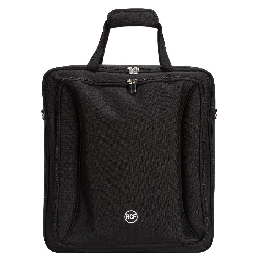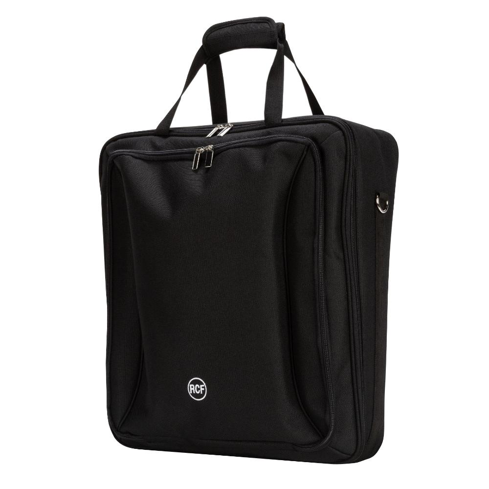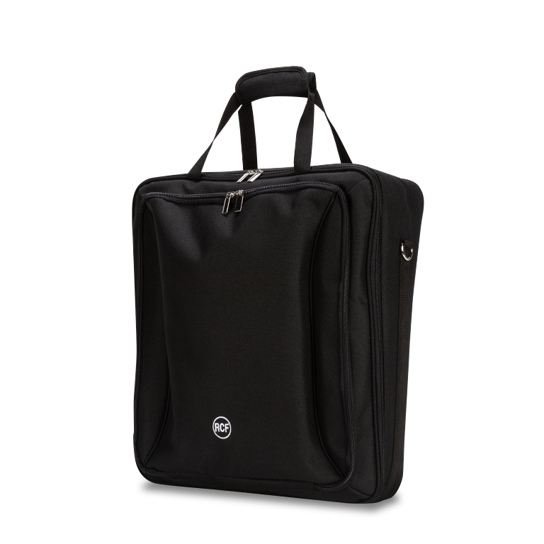 Borsa imbottita da trasporto per i mixer RCF M 20X and E 12 dotata di maniglie e tracolla da spalla. Presenta una tasca frontale con compartimento separato per tablet computers o altri accessori.