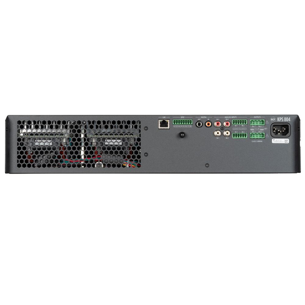 KPS 804 è un amplificatore professionale a 4 canali con potenza totale di 3200 W, progettato per le più esigenti installazioni audio, dove flessibilità, affidabilità e controllo avanzato son essenziali. Dotato di tecnologia di amplificazione in Classe D e DSP integrato, offre una gestione completa e precisa del segnale, ed una configurazione intuitiva tramite il software proprietario RDSpace. La libreria di preset per diffusori RCF rende il processo ancora più semplice ed ottimizzato. Grazie alla tecnologia Ethernet nativa è l’ideale per sistemi distribuiti con controllo indipendente delle zone, mentre l’access point wireless integrato consente il collegamento diretto con dispositivi mobili.