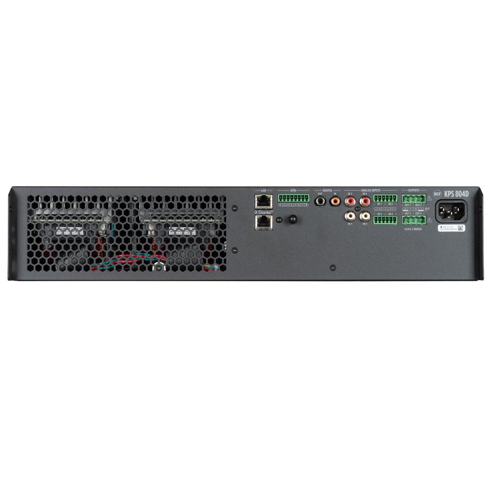 KPS 804D è un amplificatore professionale a 4 canali con potenza totale di 3200 W, progettato per le più esigenti installazioni audio, dove flessibilità, affidabilità e controllo avanzato son essenziali. Dotato di tecnologia di amplificazione in Classe D e DSP integrato, offre una gestione completa e precisa del segnale, ed una configurazione intuitiva tramite il software proprietario RDSpace. La libreria di preset per diffusori RCF rende il processo ancora più semplice ed ottimizzato. Grazie alla tecnologia Ethernet nativa è l’ideale per sistemi distribuiti con controllo indipendente delle zone, mentre l’access point wireless integrato consente il collegamento diretto con dispositivi mobili. Dotato di interfaccia verso reti Audinate Dante™ AoIP, che consente la distribuzione di 4 canali audio digitali.