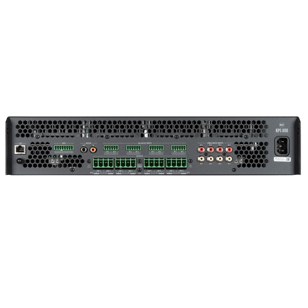 KPS 808 è un amplificatore professionale a 8 canali con potenza totale di 6400 W, progettato per le più esigenti installazioni audio, dove essenziali flessibilità, affidabilità e controllo avanzato. Dotato di tecnologia di amplificazione in Classe D e DSP integrato, offre una gestione completa e precisa del segnale, ed una configurazione intuitiva tramite il software proprietario RDSpace. La libreria di preset per diffusori RCF rende il processo ancora più semplice ed ottimizzato. Il sistema di protezioni a più stadi garantisce massima sicurezza in caso di sovraccarichi o cortocircuiti, mentre l’alimentazione universale con PFC assicura compatibilità globale e stabilità operativa. Grazie alla tecnologia Ethernet nativa è l’ideale per sistemi distribuiti con controllo indipendente delle zone, mentre l’access point wireless integrato consente il collegamento diretto con dispositivi mobili quali smartphone e tablet.