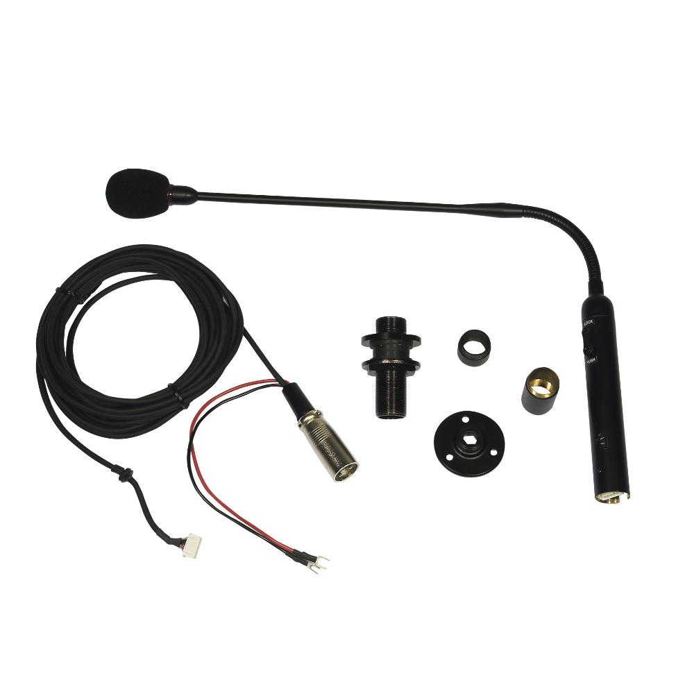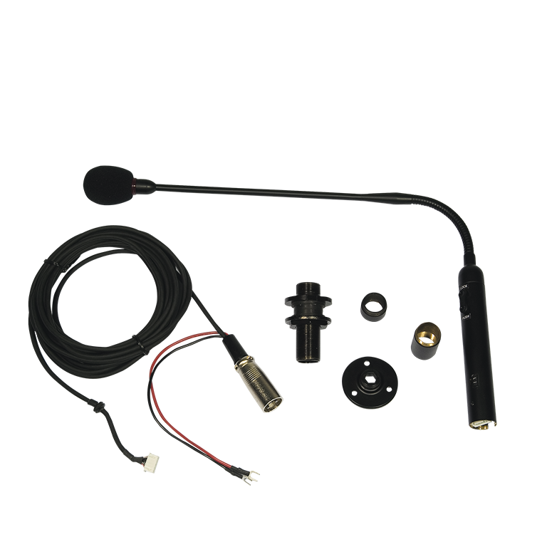 MC 4064 è un microfono ad elettrete (cardioide), con flessibile, avente ottime prestazioni acustiche e progettato per l’impiego in sistemi audio ad indirizzo pubblico. È provvisto di un interruttore (“LOCK”), un pulsante (“PUSH”), un anello rosso luminoso che si accende quando il microfono è attivato, un filtro passa-alto (disinseribile) con frequenza di taglio 100 Hz. Può essere installato su un tavolo (con o senza foro), un leggio od un’asta da pavimento (per microfoni). Richiede l’alimentazione “Phantom”, pertanto deve essere connesso ad un ingresso microfonico (di un mixer / preamplificatore) avente una tensione “Phantom” compresa tra 12 V ÷ 52 V.