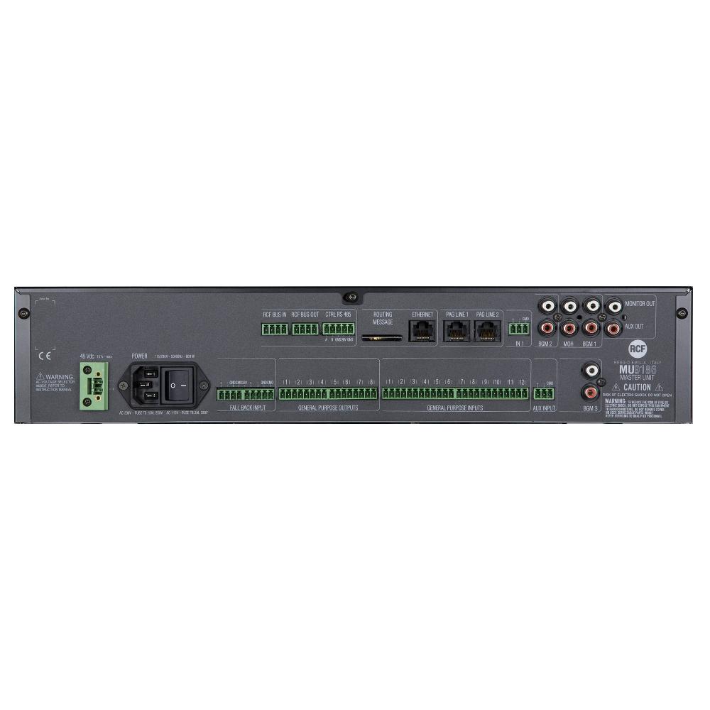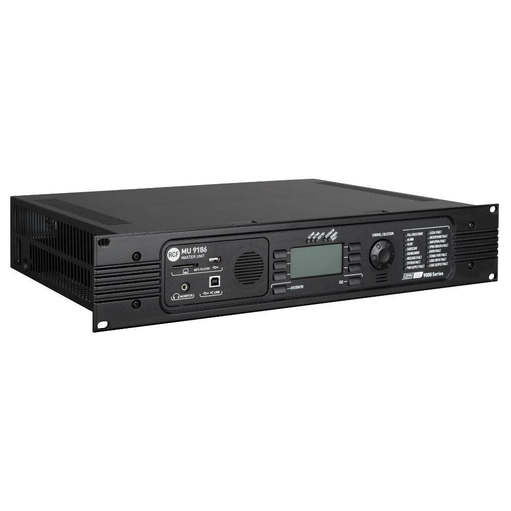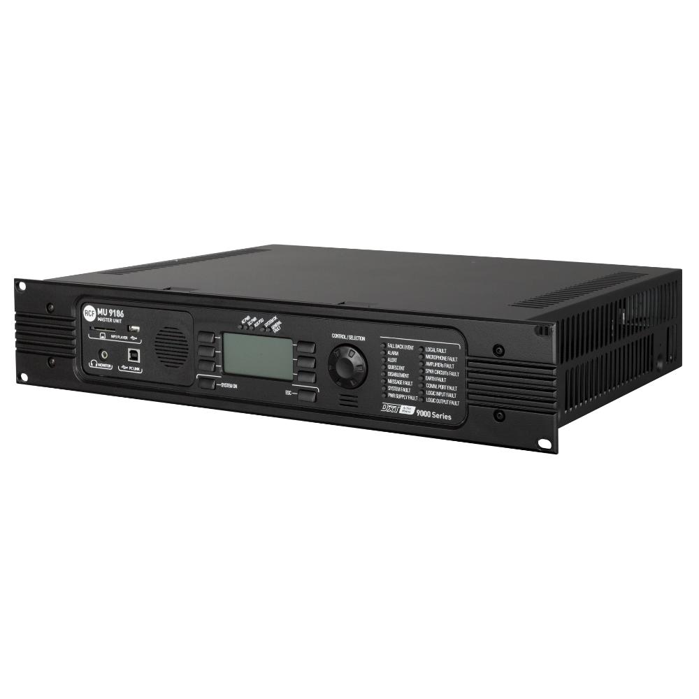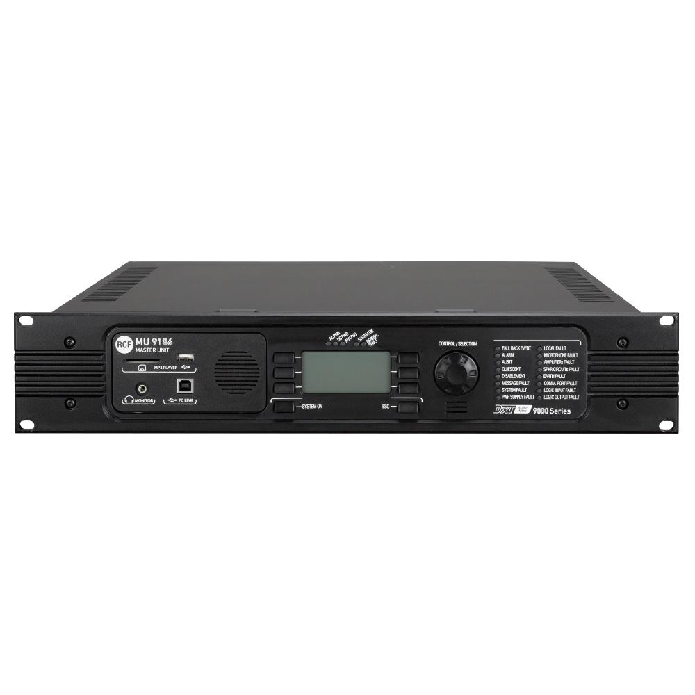 MU 9186 è l'unità centrale del sistema DXT 9000 senza amplificatore di potenza a bordo: si utilizza nelle applicazioni di medie e grandi dimensioni che richiedono un'elevata potenza di uscita e un gran numero di zone da gestire. Questo si ottiene collegando fino a 31 unità slave amplificate UP 9501 (1 x 500 W), UP 9502 (2 x 250 W) e UP 9504 (4 x 125 W), collegate tramite il bus di comunicazione dedicato. Il sistema può essere completato con diversi modelli di basi microfoniche di emergenza, alimentatori EN 54-4, accessori e software di gestione e monitoraggio.