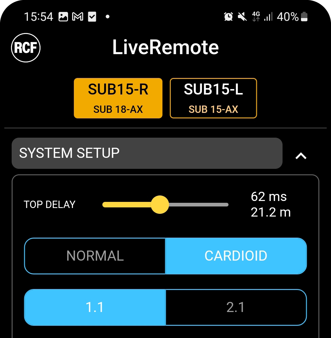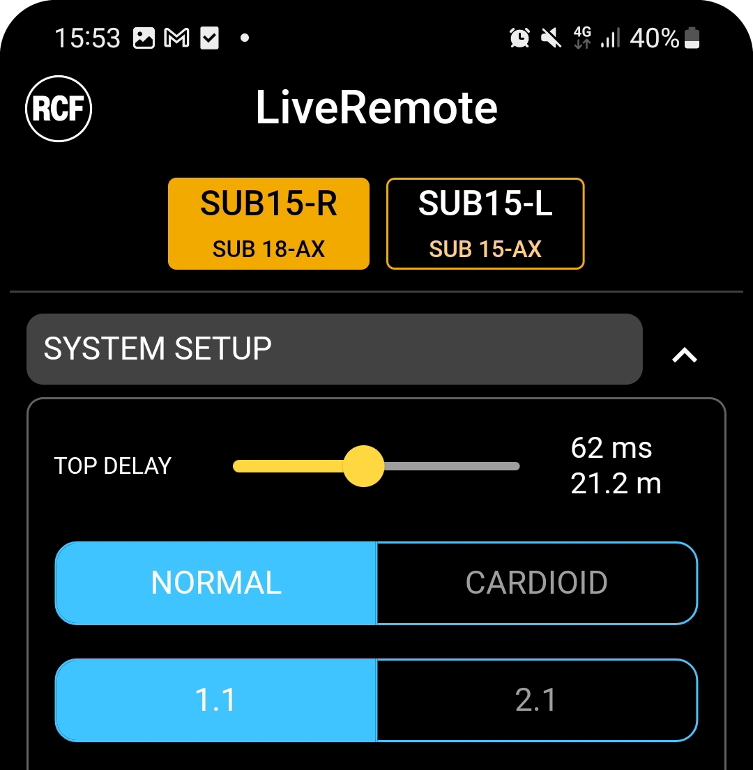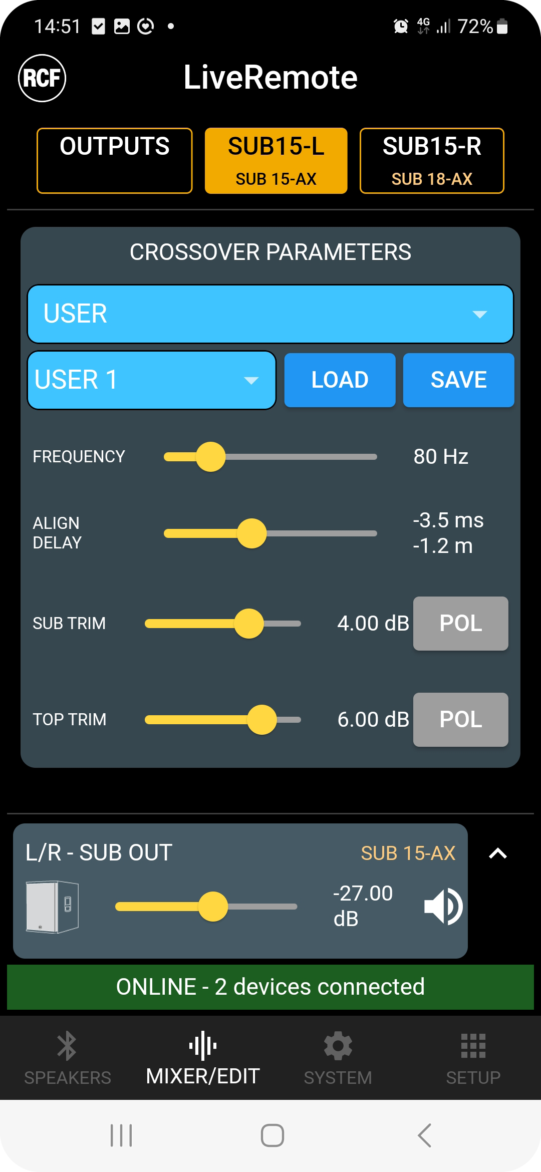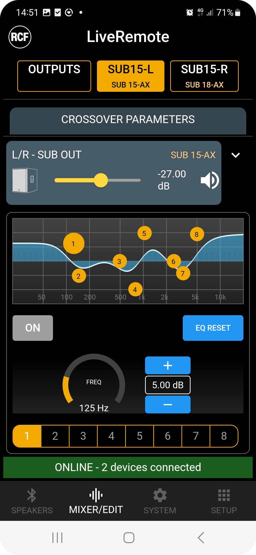 Con l'app RCF LiveRemote puoi controllare via Bluetooth® dal tuo smartphone o tablet fino a 8 dispositivi AX contemporaneamente. L'app permette di regolare i parametri interni e salvare e richiamare i preset. Puoi utilizzare l'app anche per controllare l'intero sistema audio, grazie a un equalizzatore a 8 bande completo e a funzioni avanzate.