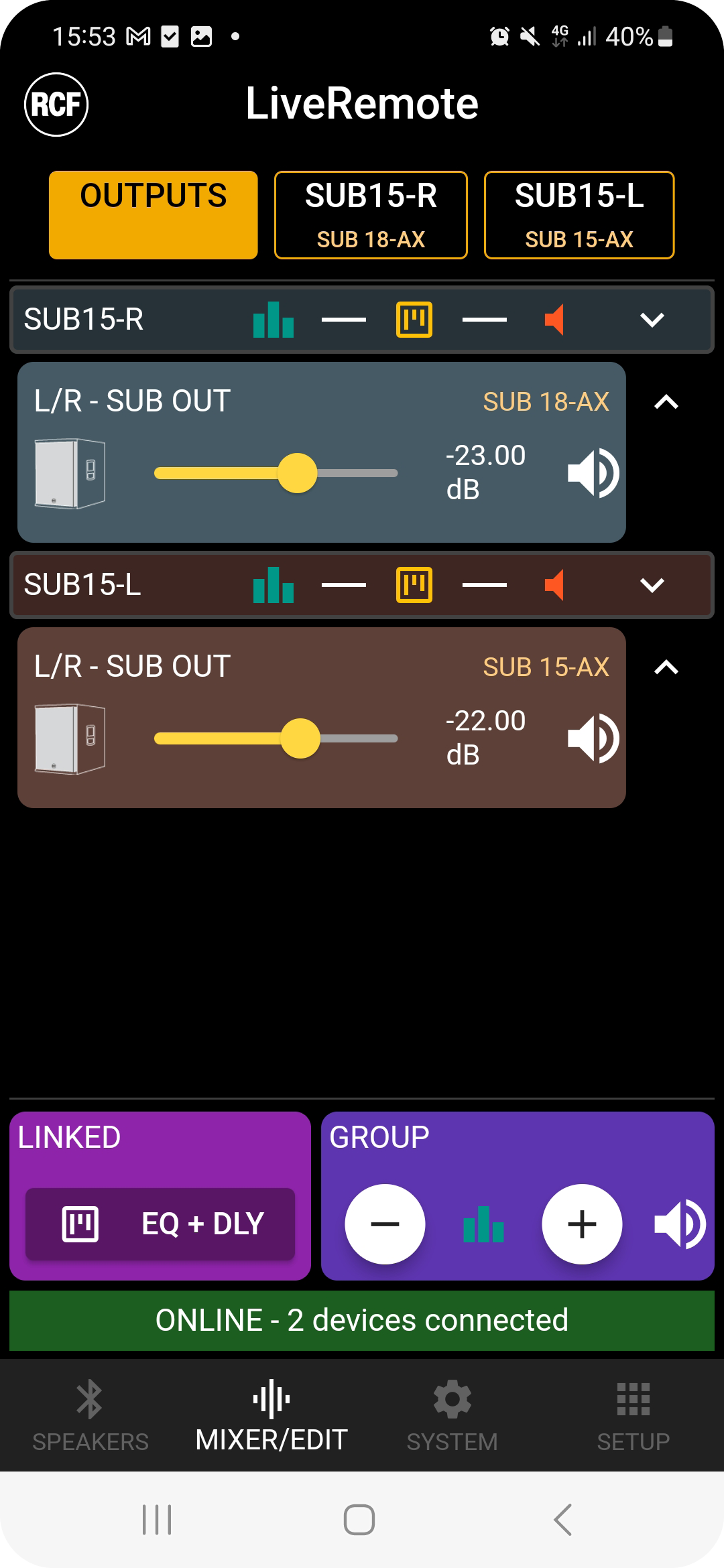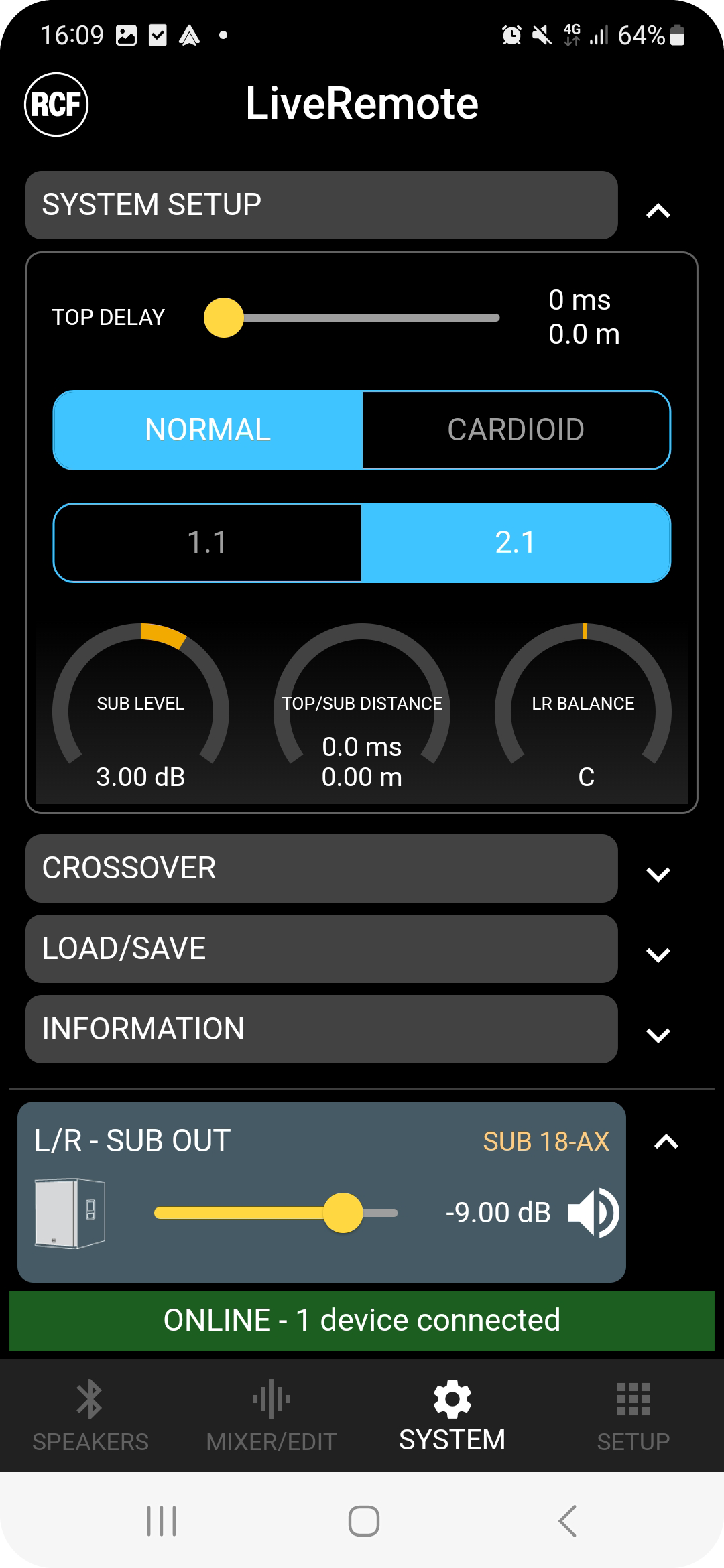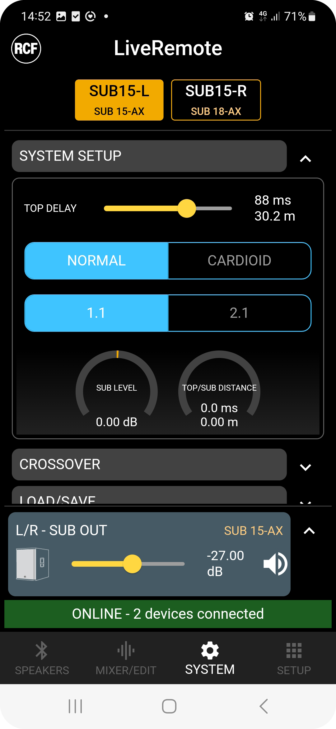 Con l'app RCF LiveRemote puoi controllare via Bluetooth® dal tuo smartphone o tablet fino a 8 dispositivi AX contemporaneamente. L'app permette di regolare i parametri interni e salvare e richiamare i preset. Puoi utilizzare l'app anche per controllare l'intero sistema audio, grazie a un equalizzatore a 8 bande completo e a funzioni avanzate.